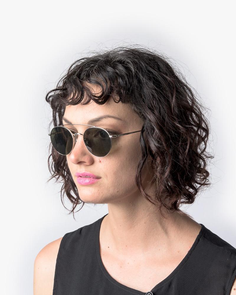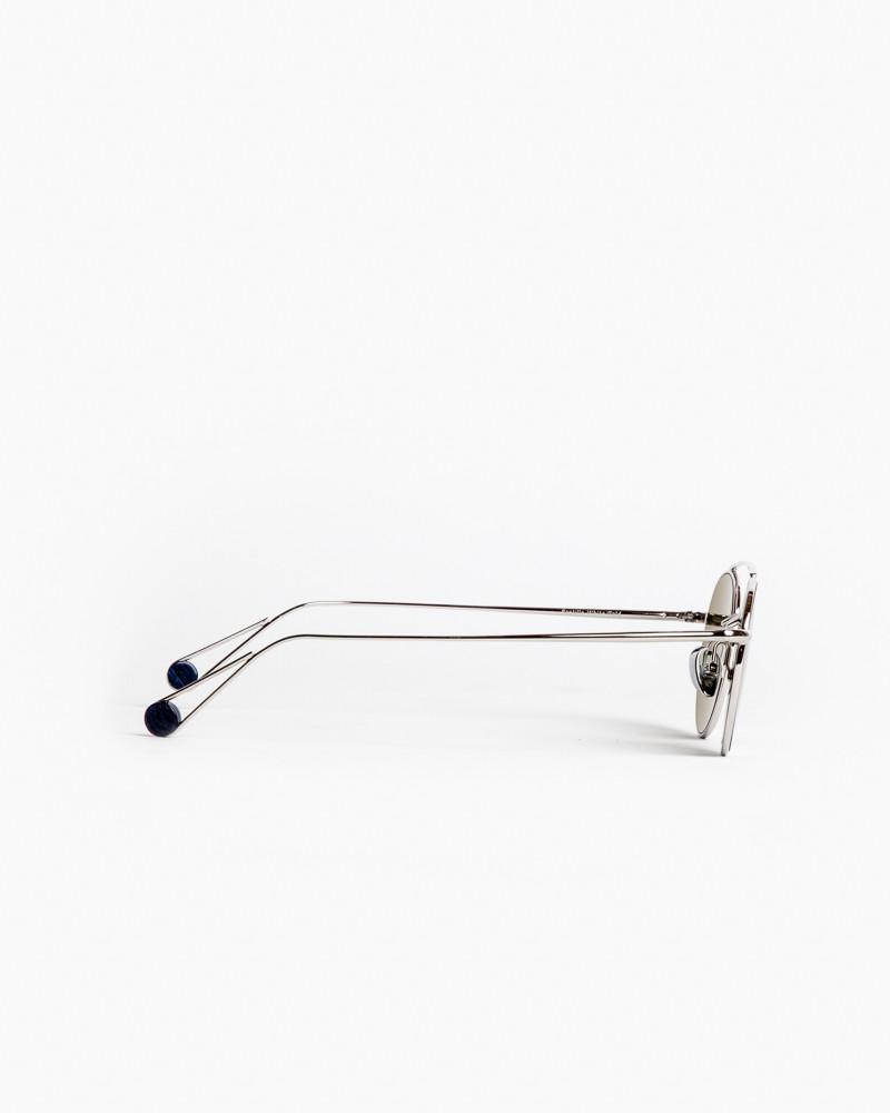Bastille Sunglasses in White Gold by Ahlem. Classic yet modern sunglasses feature a brushed white gold frame, brow bar, flat grey/green lenses, ceramic nose pads, and signature vintage acetate temple tip.