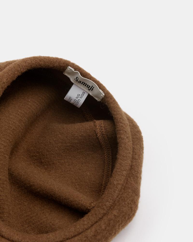Beret Hat in Brown by Samuji. Made from a soft wool blend, this beret-style hat features pom-pom detailing and brown tonal stitching throughout.