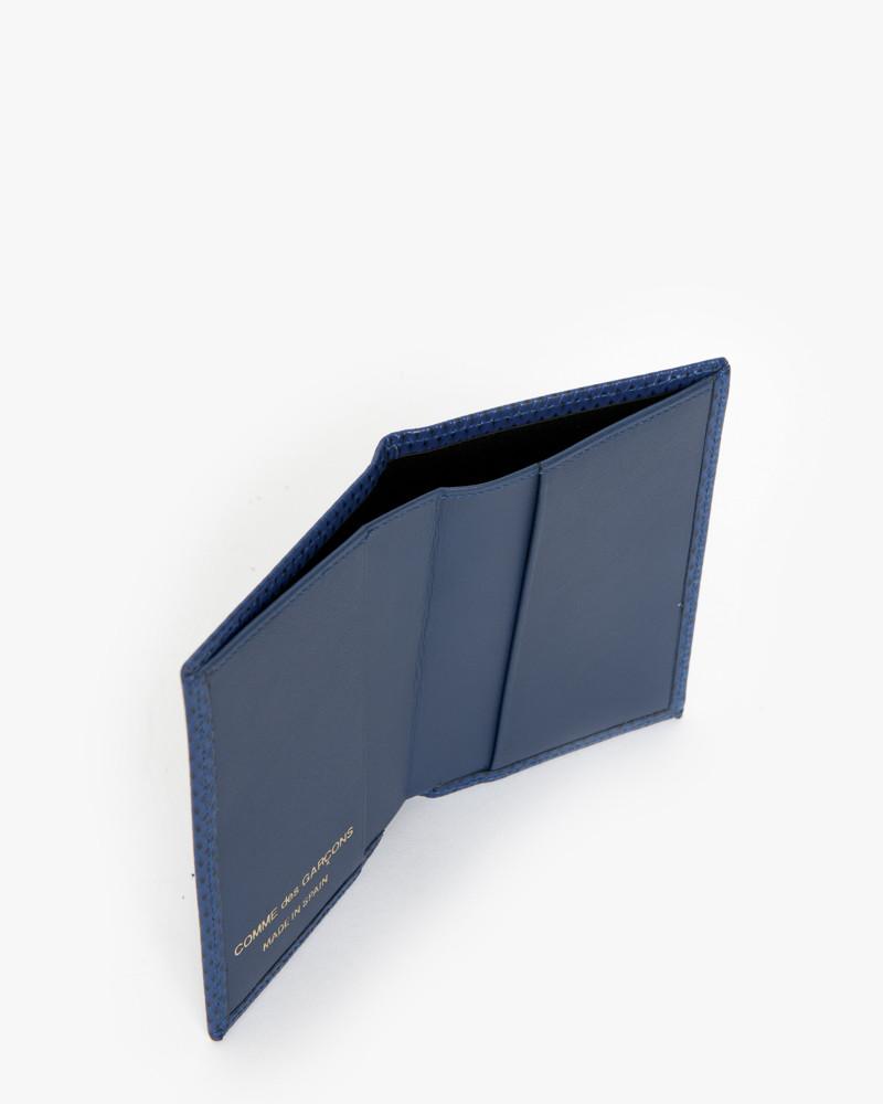 Luxury Group 6100 LG in Blue by COMME des GARÇONS. Blue leather wallet features bi-fold style, two-toned color between exterior and interior, clean lines, cult-favorite design, and logo written at interior in gold matte font.