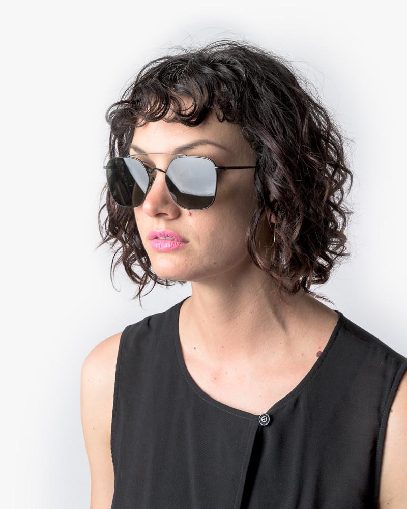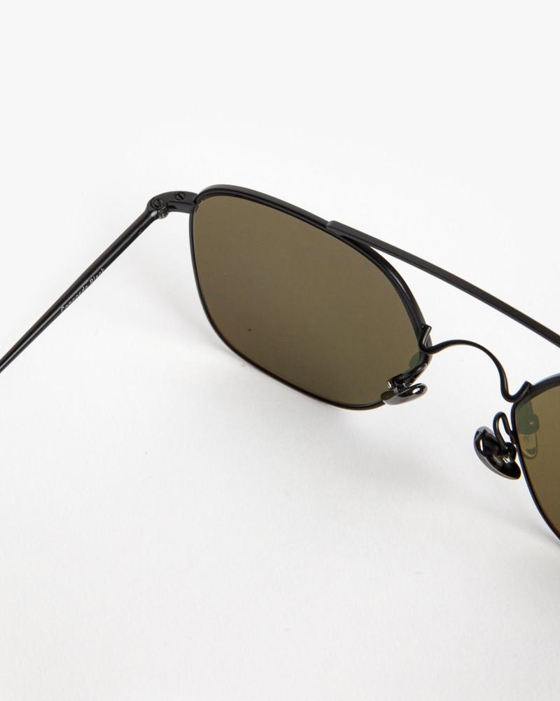 Concorde Sunglasses in Black by Ahlem. Classically cool sunglasses feature a matte black metal frame, flat brown/green lenses, flex hinges, ceramic nose pads, and signature vintage acetate temple tip.