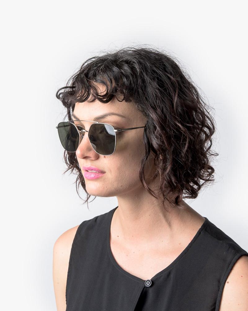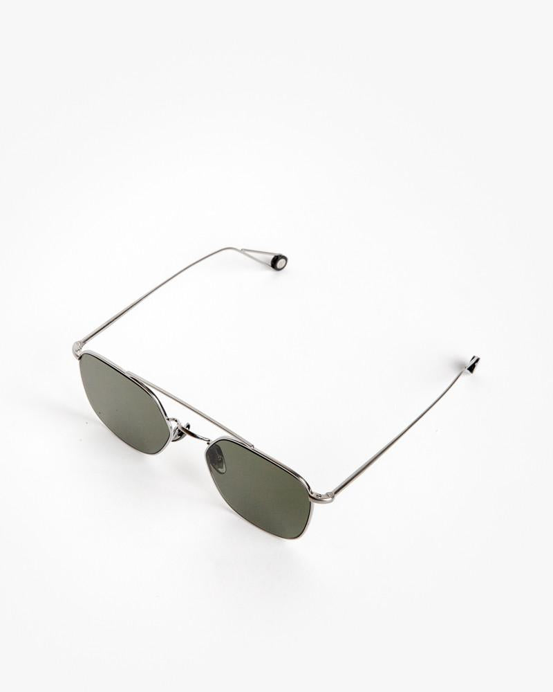 Concorde Sunglasses in Grey by Ahlem. Classically cool sunglasses feature a matte brushed white gold frame, flat grey/green lenses, flex hinges, ceramic nose pads, and signature vintage acetate temple tip.
