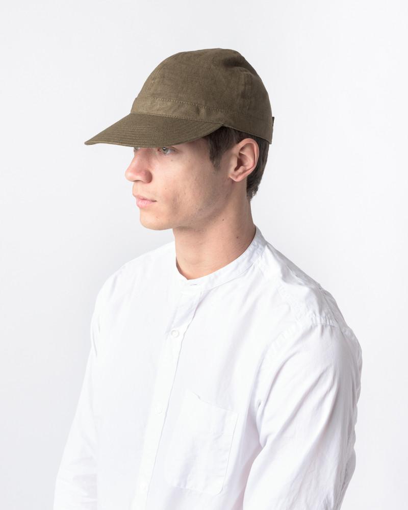 Linen Scout Cap in Olive by SMOCK Man. Lightweight hat features a flexible, quilted brim, four panel top, four metal ventilation rivets, and an adjustable velcro panel at back.