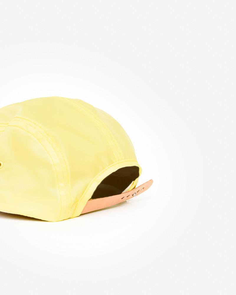 Nylon Jet Cap in Yellow by Hender Scheme. A nylon five pannel, snap back hat with a clean aesthetic includes seam taping, a natural leather fastening strap,a cotton twill sweatband, a stamped raw leather logo patch at sweatband and coated brass hardware.