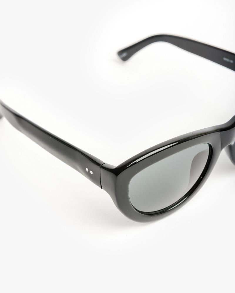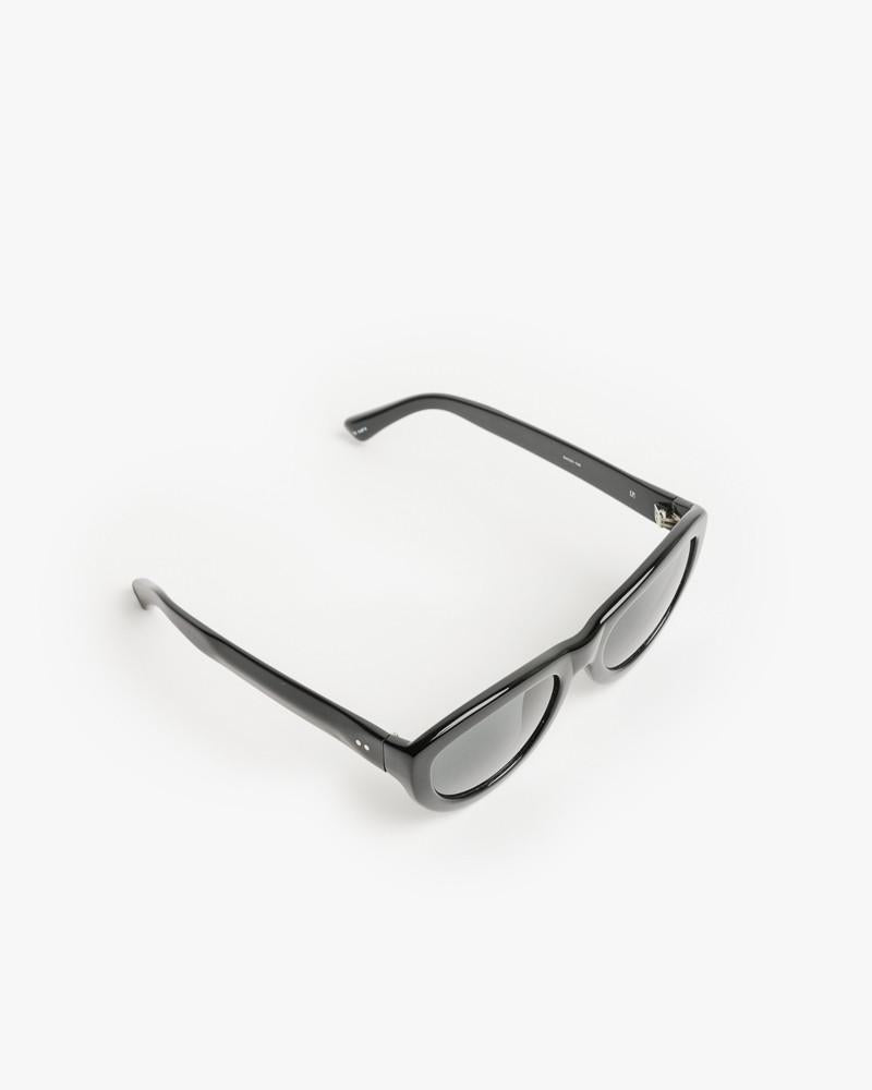 Sunglasses in Black/Silver/Grey by Dries Van Noten x Linda Farrow. Inspired by the grandeur of the Italian heiress and patroness of the arts, Luisa Casati, these Dries Van Noten feline angular cat eye sunglasses in black are handmade from high-shine acetate with grey gradient lenses and signature beveling and stainless steel pin details at temples as well as Dries Van Noten branding in the inverted side of the temple.