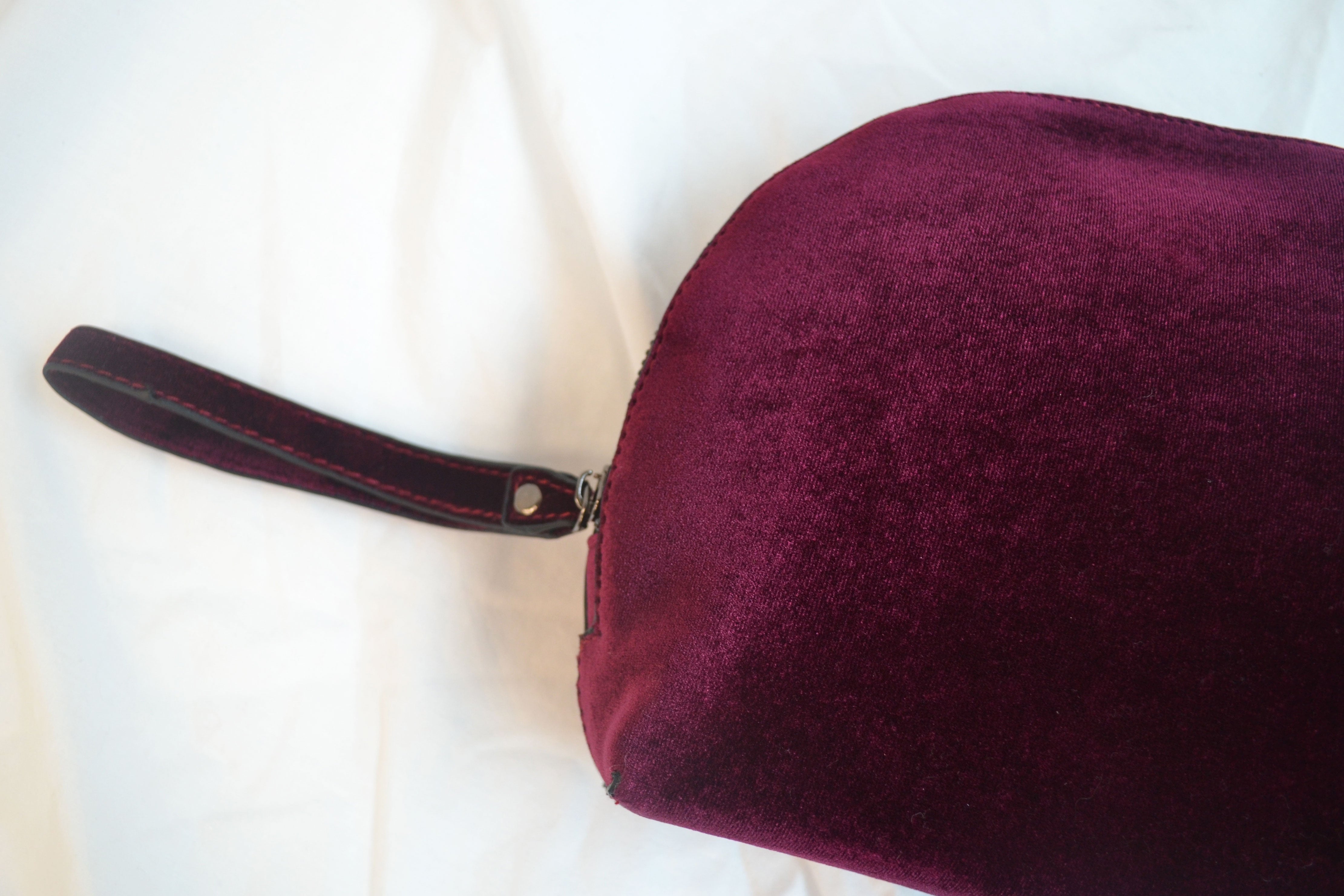 MIGRI timeless dome style pouch is crafted in soft maroon velvet and trimmed with a secure zip fastening with a detailed zip pull. There is a small pocket inside and finished with a wristlet strap for added security. A logo is stamped on the front for extra detail.
