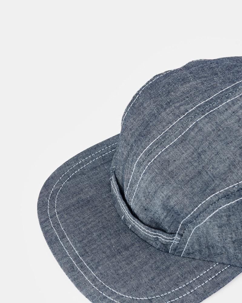 Field Cap in Blue Print by Engineered Garments. This utilitarian and refined field cap with four panels, a front loop detail as well as a flexible bill and flat peak in an indigo print with white tonal stitching.