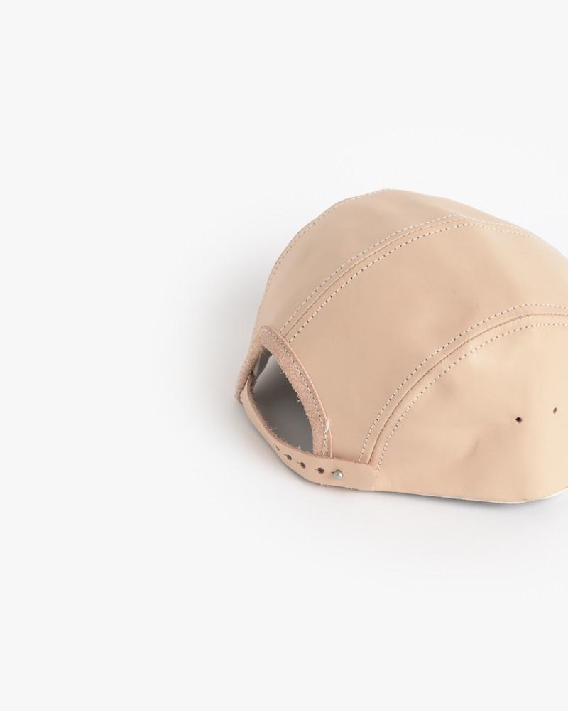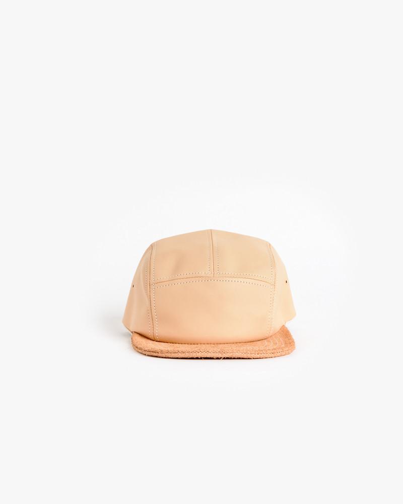 Jet Cap in Natural Leather by Hender Scheme. Structured yet malleable hat features a waterproof five-panel dome, natural leather brim, simple vents at sides, and adjustable leather strap at back.