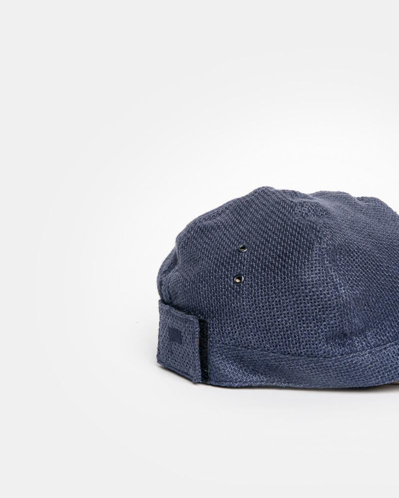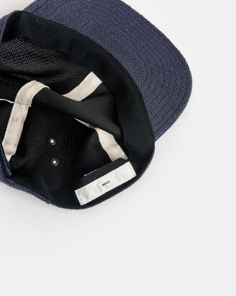 Logo Cap in Navy by SMOCK Man. A perfect summer item this lightweight hat comes in a breathable linen with mesh like perforation details; features include a flexible, quilted brim, a four panel top, four metal ventilation rivets and an adjustable velcro panel at back with the classic smock flap logo embroidered in navy at back panel.