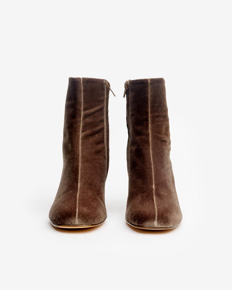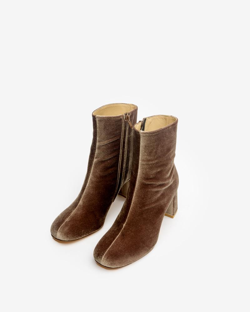 Agnes Boot in Brown Velvet by Maryam Nassir Zadeh. Made from soft suede, these slim-fitted mid-calf boots feature a seamed front center and slightly squared toe, zip closure at inner side, a covered block heel, tonal stitching, and a suede upper with beige leather lining, sole and rubber heel cap.