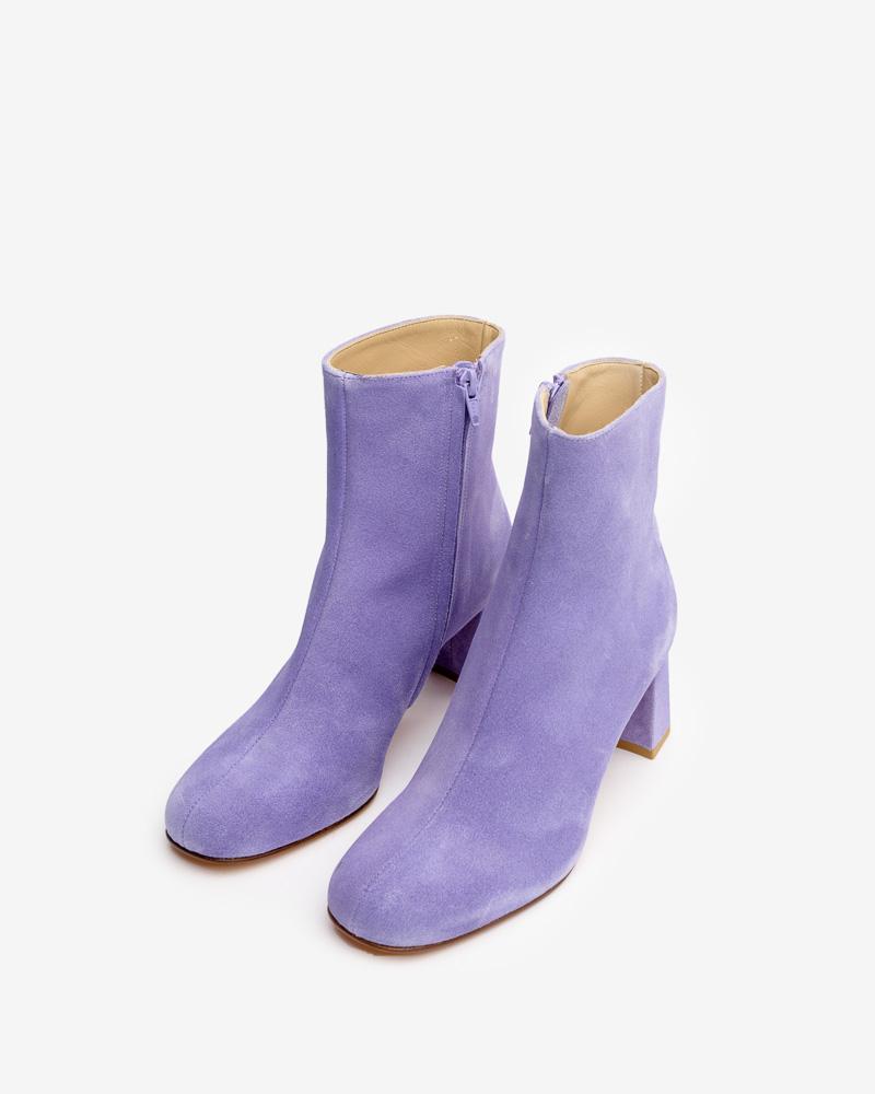 Agnes Boot in Iris Suede by Maryam Nassir Zadeh. Made from soft suede, these slim-fitted mid-calf boots feature a seamed front center and slightly squared toe, zip closure at inner side, a covered block heel, tonal stitching, and a suede upper with beige leather lining, sole and rubber heel cap.