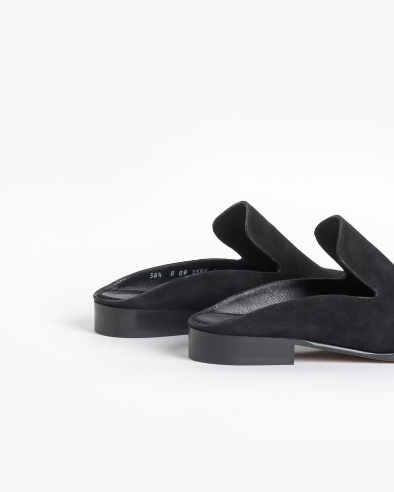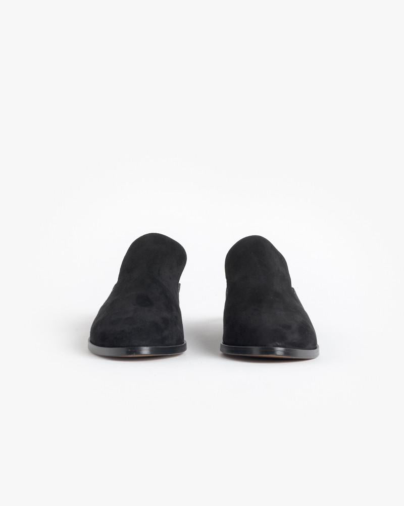 Alicel Slip On in Black Suede by Robert Clergerie. Moccasin shaped closed toe mule features a suede upper, leather lining, stacked wooden heel, and leather sole.