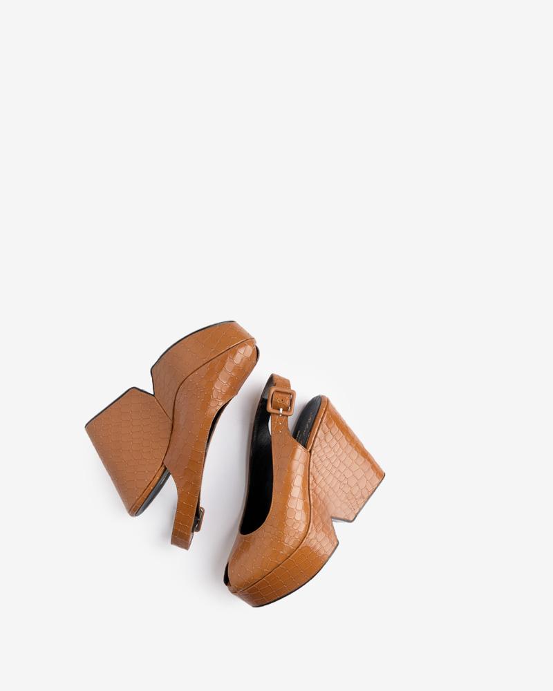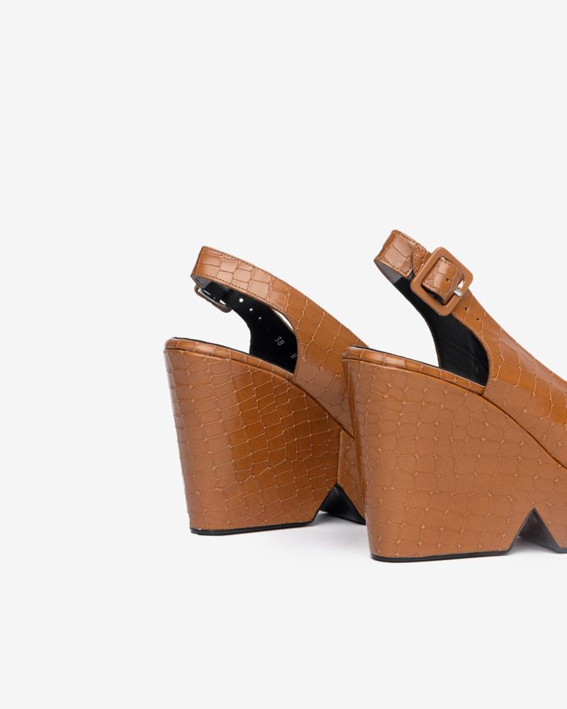 Dylann Heel in Cocco by Robert Clergerie. Coated in crocodile grained calfskin, these camel wedges from Robert Clergerie are a statement piece all on their own. These shoes feature a peep-toe style with a buckle fastening ankle strap, leather lining and insole, and a rubber sole.- Material: calfskin leather and rubber