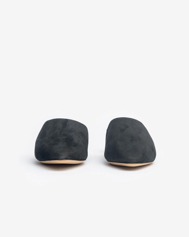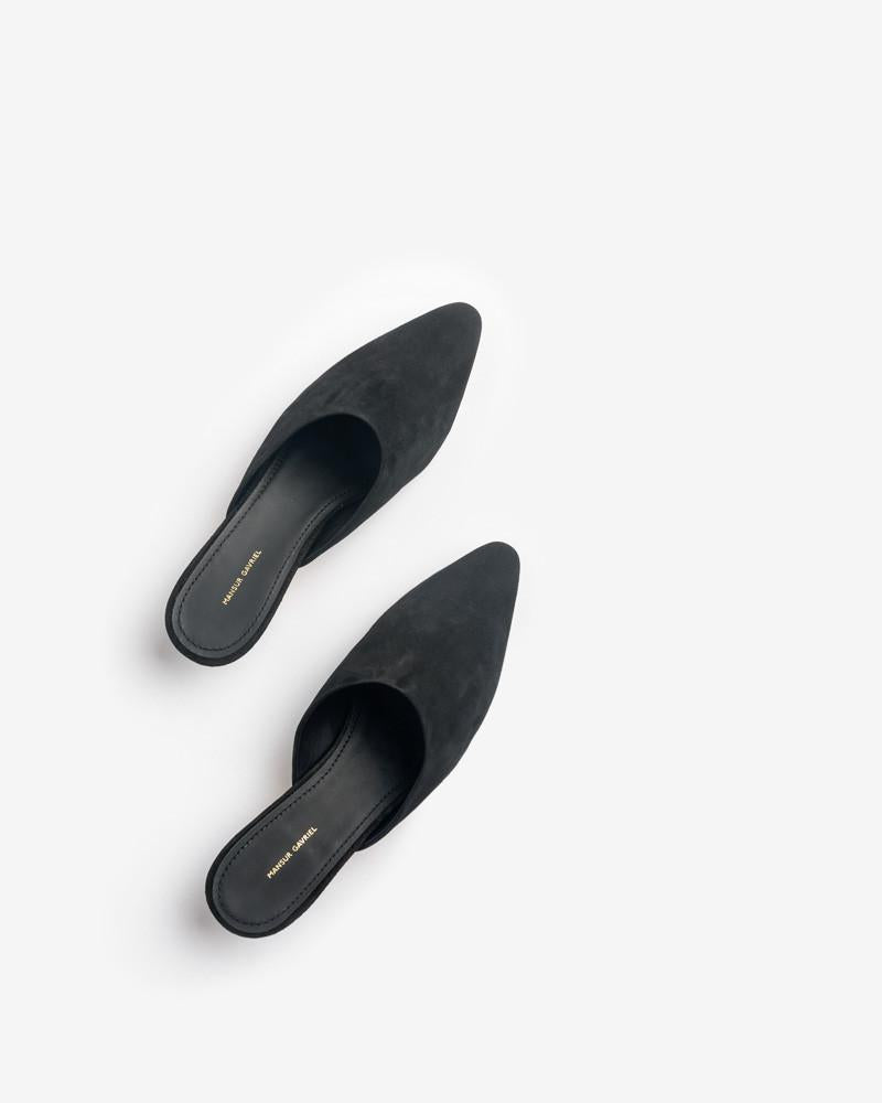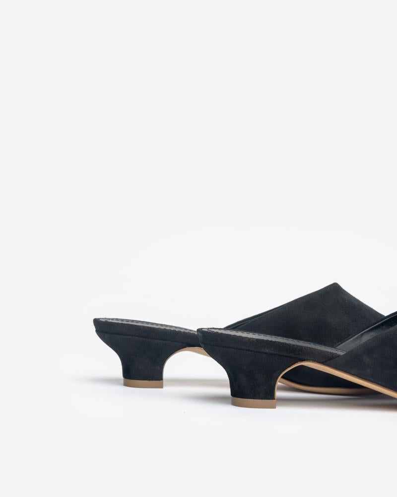 Sleek black slides crafted in incredibly soft suede. Featuring an elegant pointed toe, easy-to-walk-in kitten heel, and soft leather insole.