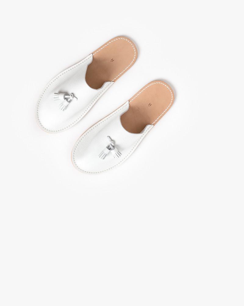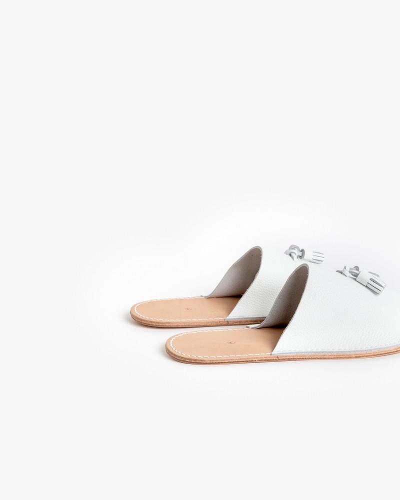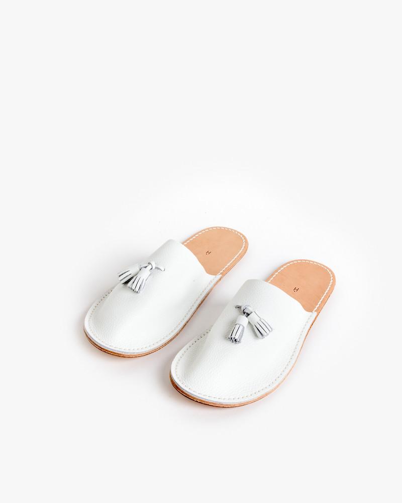 Leather Slipper in White by Hender Scheme. Classic slipper features an unlined supple leather upper, flat leather sole, tassel on toe box, white contrast stitching, and stamped logo at heel.