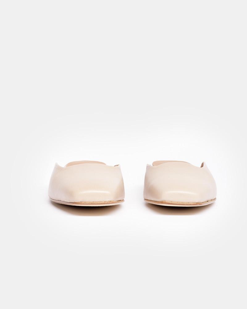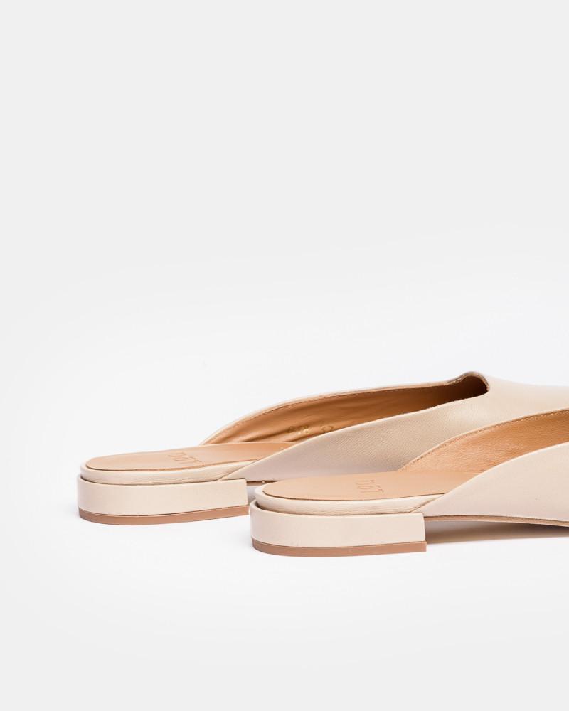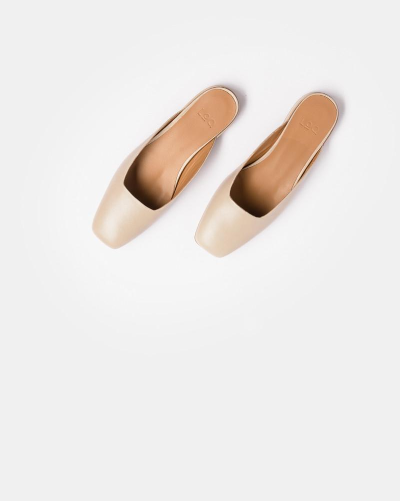 Lucia Flat in Yute by LOQ. A minimalist supple leather slide with tan leather upper, square toe, padded footbed and leather wrapped heel.