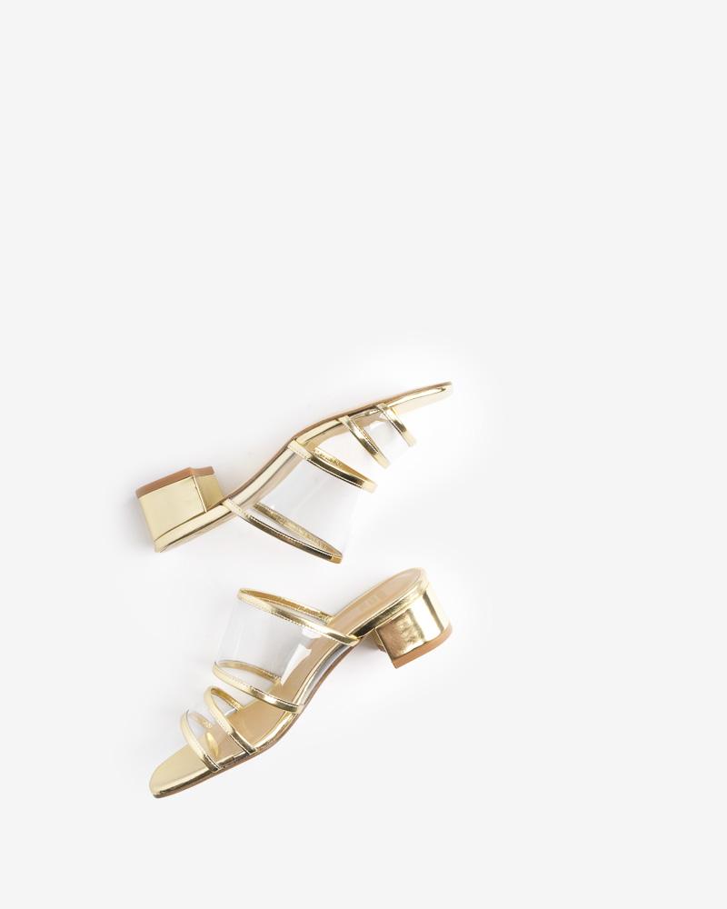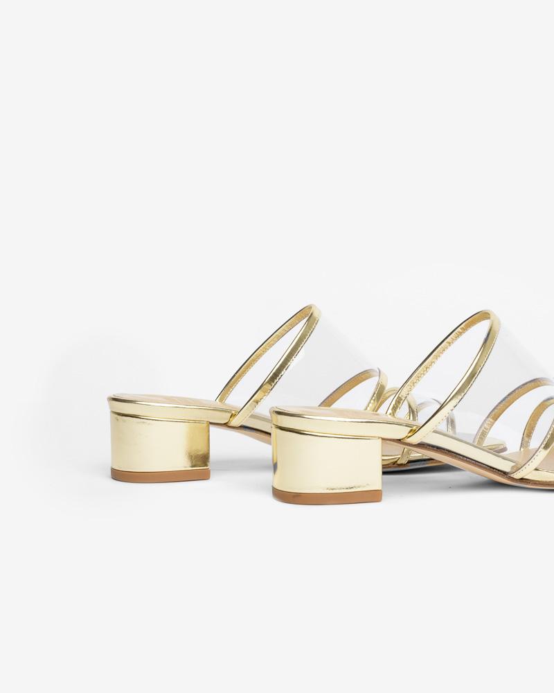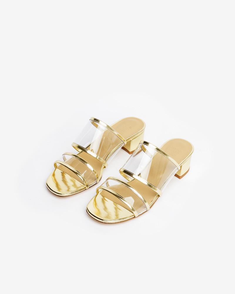 Martina Clear Slide in Gold Metallic by Maryam Nassir Zadeh. These open-toed sandals are styled with transparent perspex straps, gold leather trim, a covered block heel, and a leather sole.