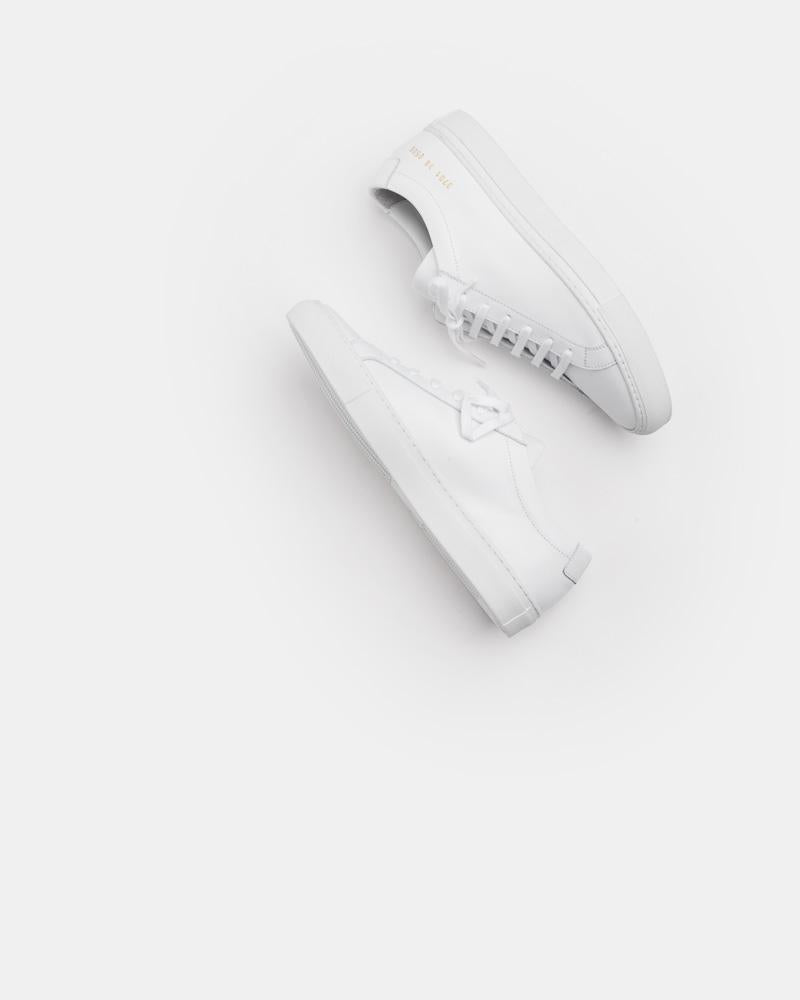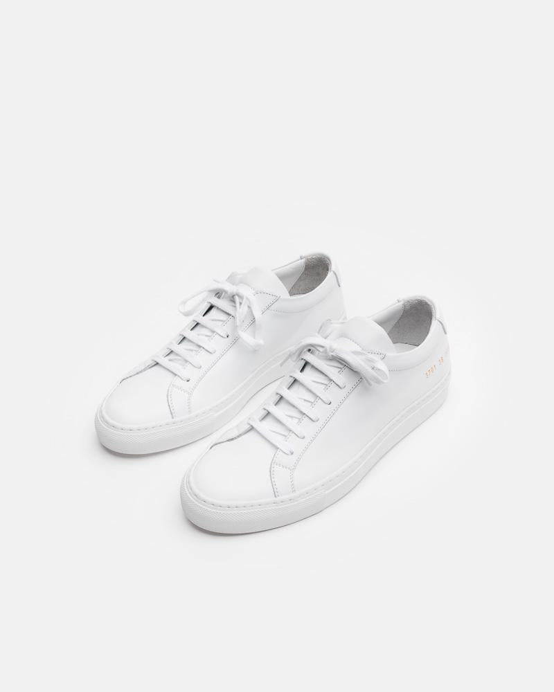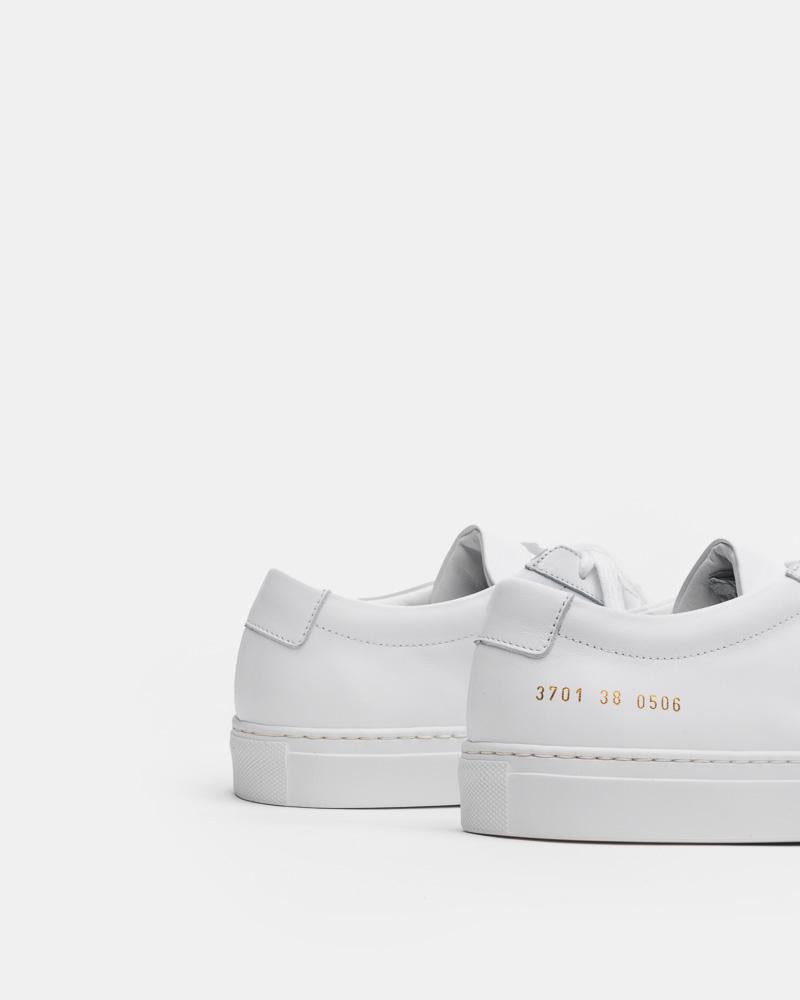 Original Achilles Low 3701 in White by Common Projects. These low-top buffed leather sneakers in white feature a round toe, tonal lace-up closure, padded tongue and collar, a series number stamp in gold-tone at outer heel, tonal leather lining, rubber sole, and tonal stitching throughout.