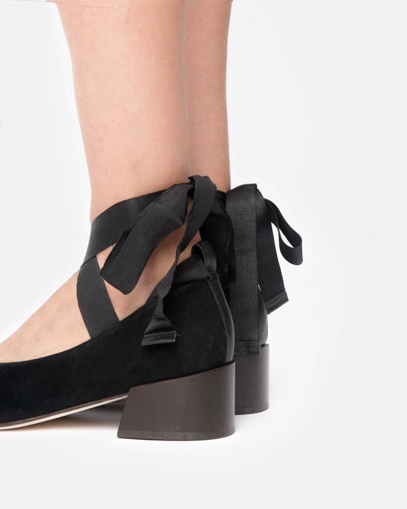 Pina Ballerina in Preto Suede by Mari Giudecelli. Pina Ballerina in Preto Sude by Mari Giudicelli. These ballet inspired shoes are delicate and versatile with a slightly rounded toe, a carved wooden block heel, a removable gros-grain ankle ribbon, and a suede upper with a full calf-lining.