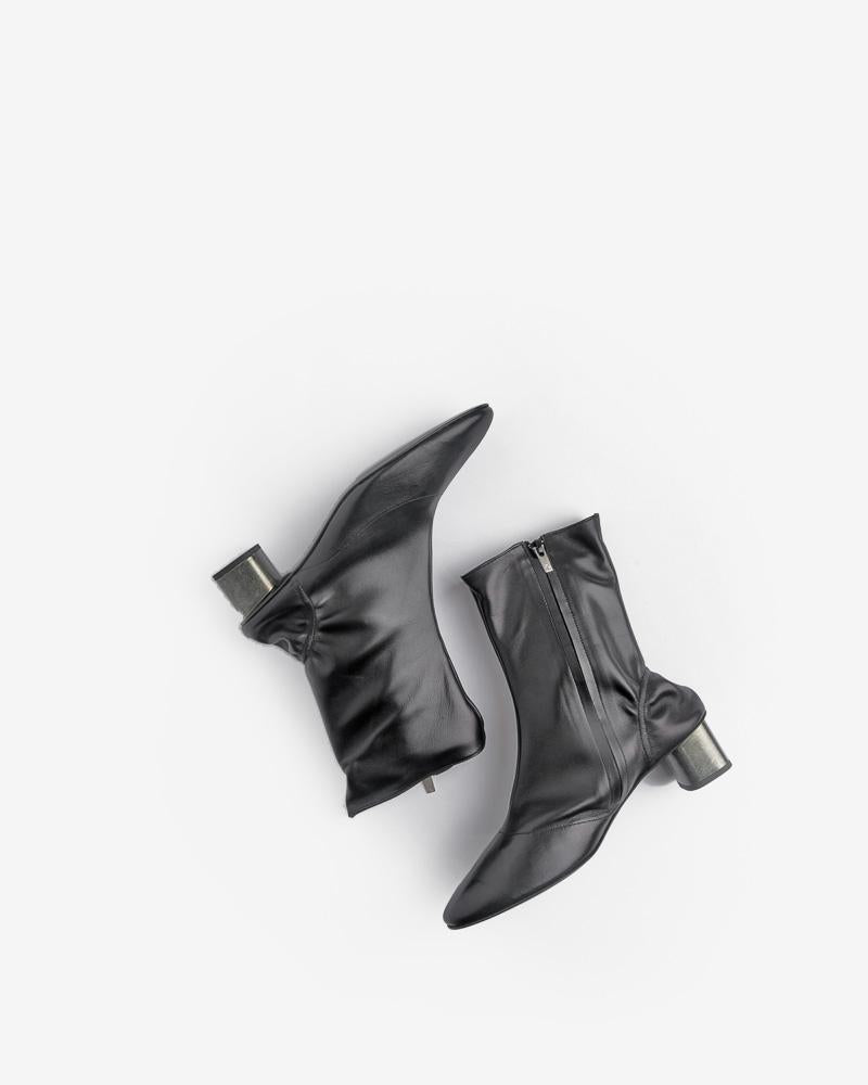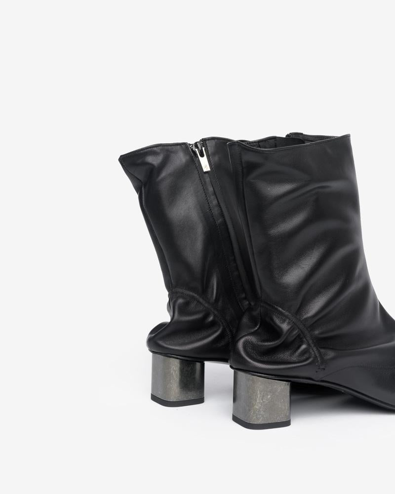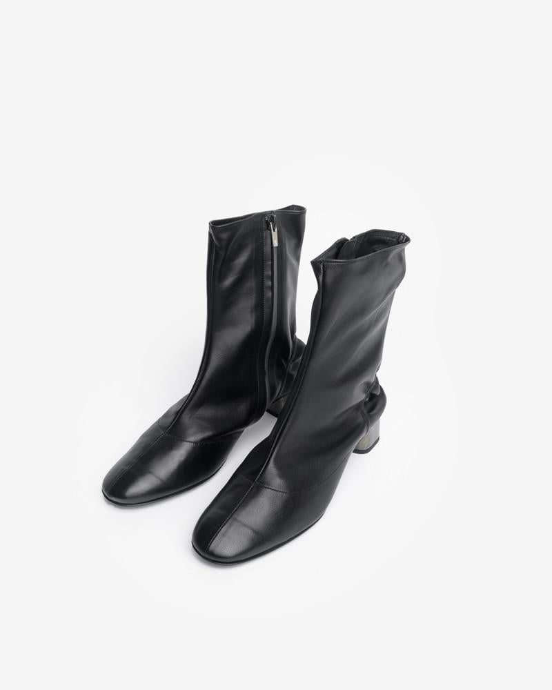 Plop Boot in Black by Robert Clergerie. These statement boots feature a round toe, zip closure at medial side, elasticized panel at heel, soft leather lining, padded footbed, tonal stitching throughout, and an 'ice-cube' heel.