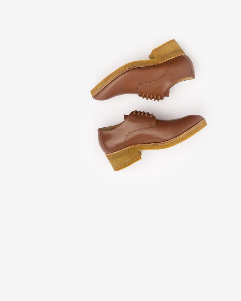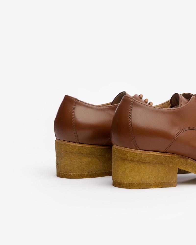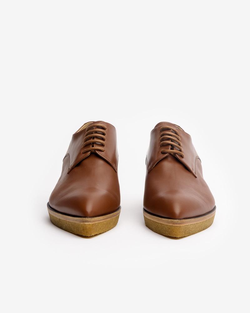 Pointed Toe Oxford in Cognac by Dries Van Noten. Crafted in Italy of smooth brown leather, this classic lace-up style is designed with a pointed toe, a rubber crepe block heel, round laces, and a leather lining.