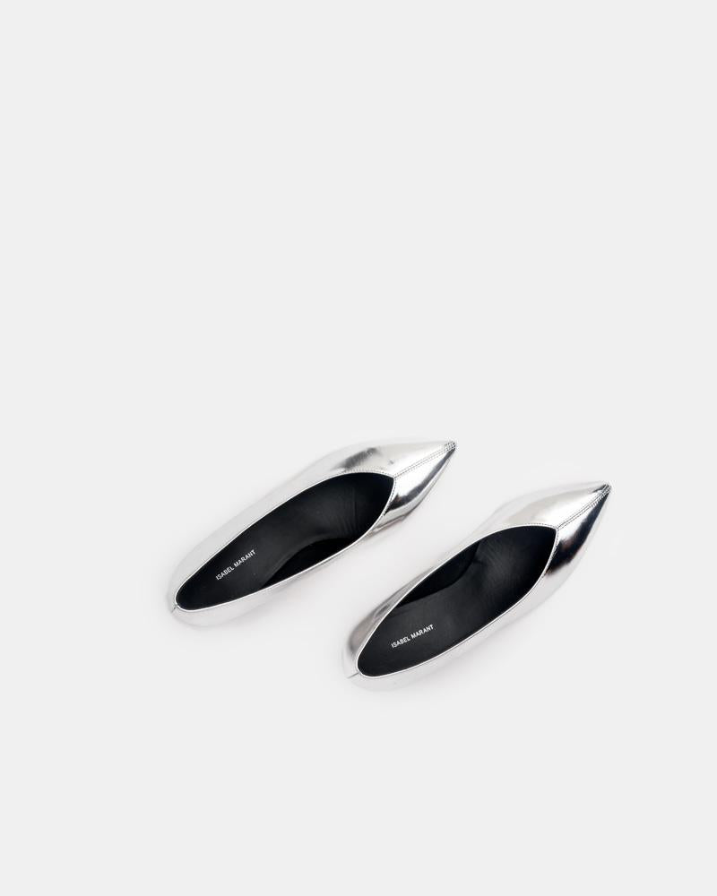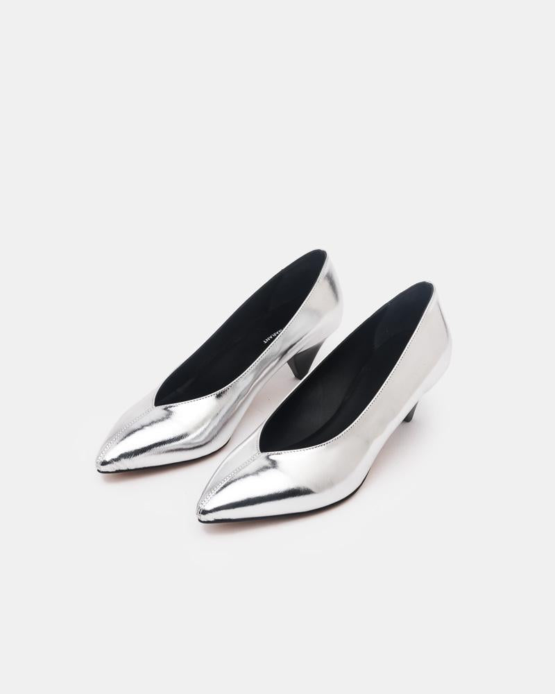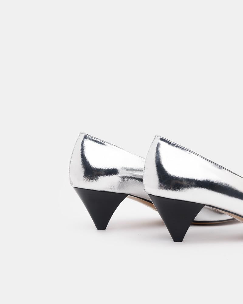 Poomi Pumps in Silver by Isabel Marant. Crafted from silver metallic calfskin, these pumps are styled with a pointed toe, V-shaped slip-on style, black triangular heel, leather lining, and leather sole.- Leather upper