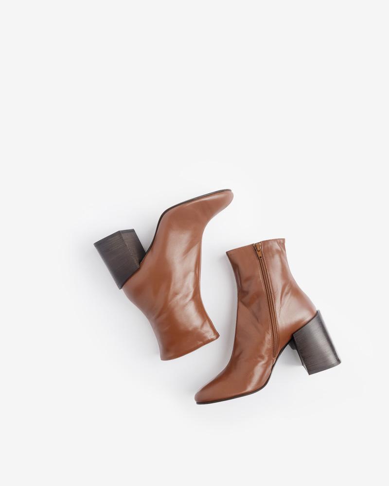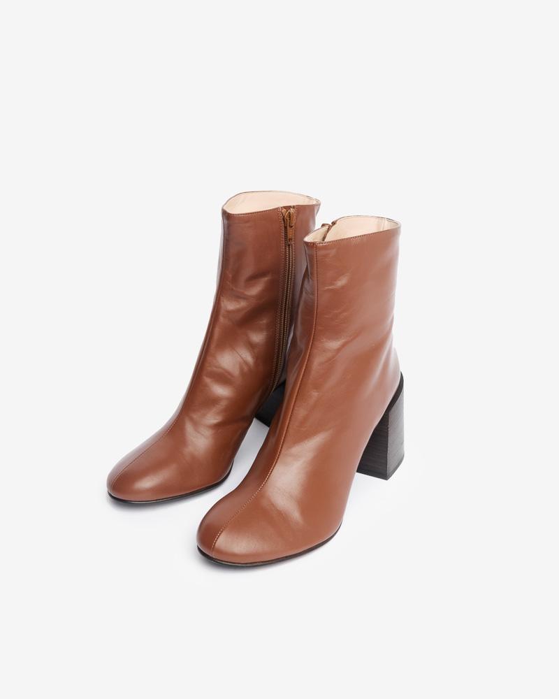 Saul Boot in Cognac Brown by Acne Studios. These ankle boots feature a smooth calf skin upper, round toe, a subtle center seam, zip closure at inner side, tonal stitching and hardware, and a stacked block heel in brown.