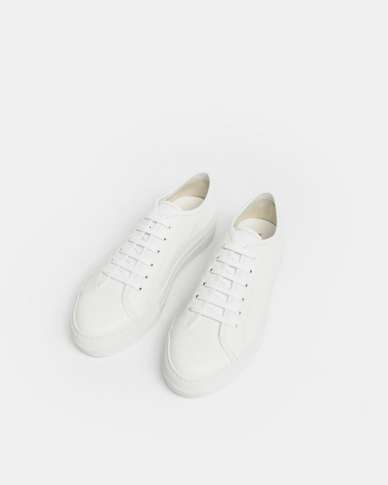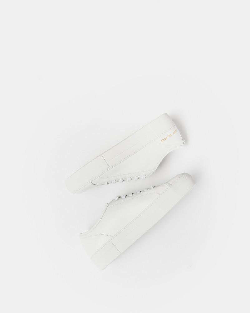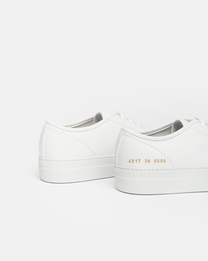 Tournament Low Super in White by Woman by Common Projects. These luxurious, sleek and minimalistic sneakers feature a leather upper, leather lining, a rubber outsole and and the signature gold serial number all with a slightly higher sole.