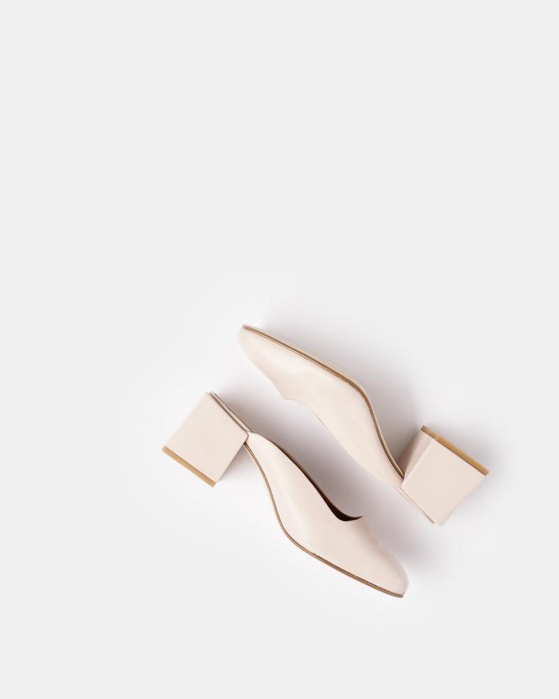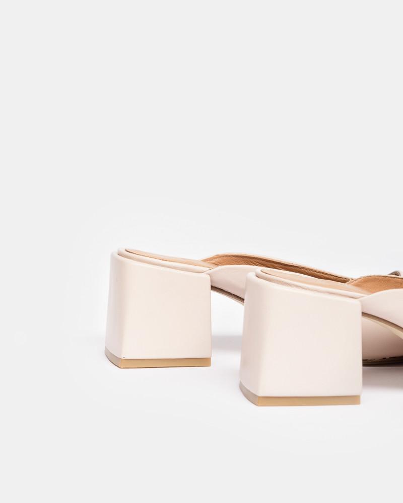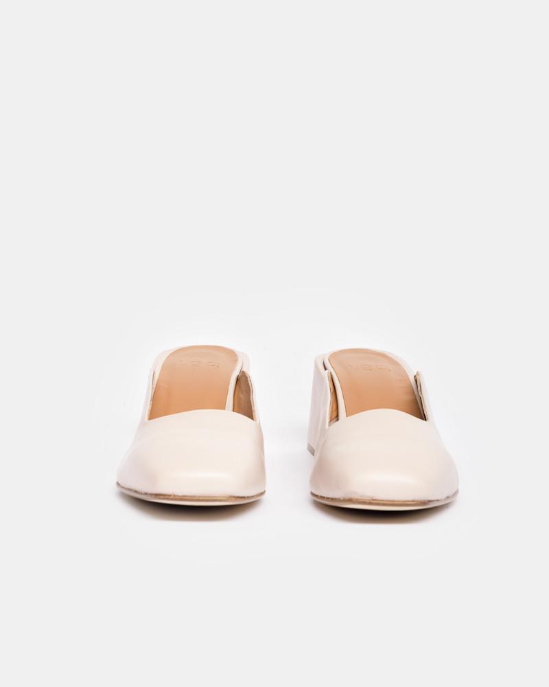 Vale Nude Heel in Napa by LOQ. A minimalist supple leather slide with wrapped leather block heel, square toe, a padded footbed and all leather upper in a tan hue.