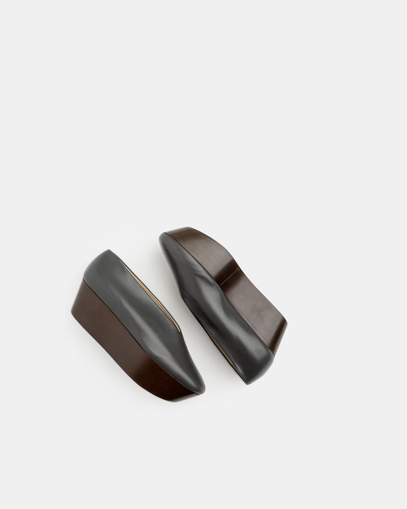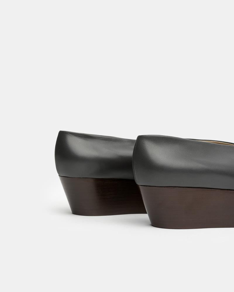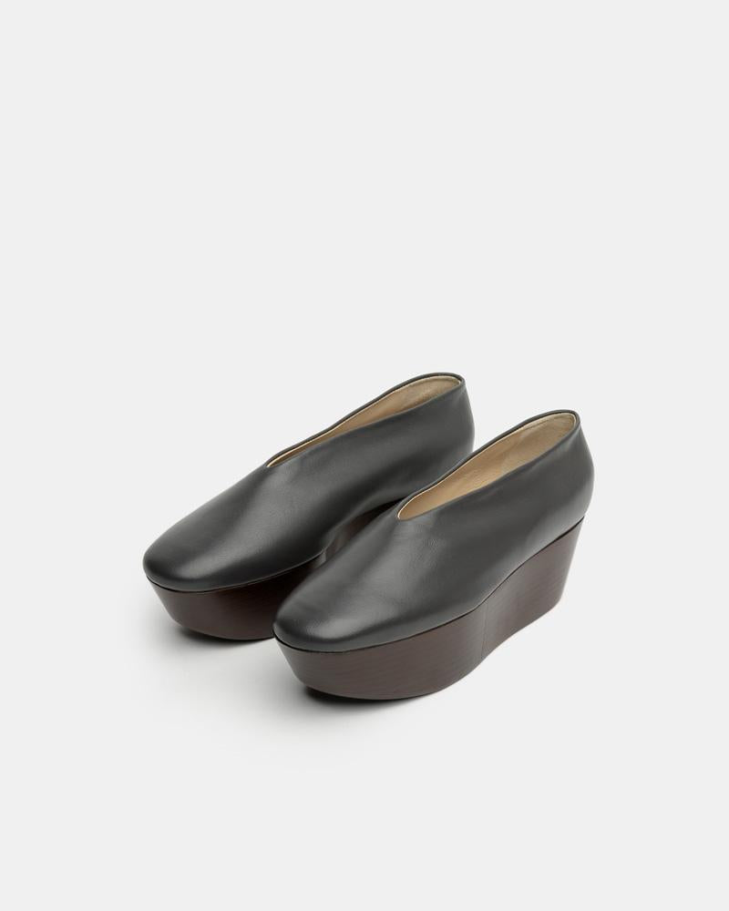 Wedge Slippers in Anthracite by Lemaire. These buffed leather platform slippers in dark grey feature a round toe, contrast wooden platform, and tonal stitching.