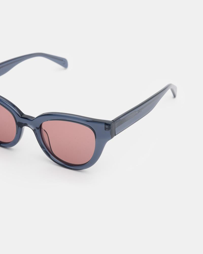 Barton Sunglasses in Indigo/Nightshade by Carla Colour. Described by the designer as "the lovechild of Roy Orbison and Cleopatra" these sleek and strong sunglasses feature a subtle cat eye shape, acetate frames, and purple-grey lenses.
