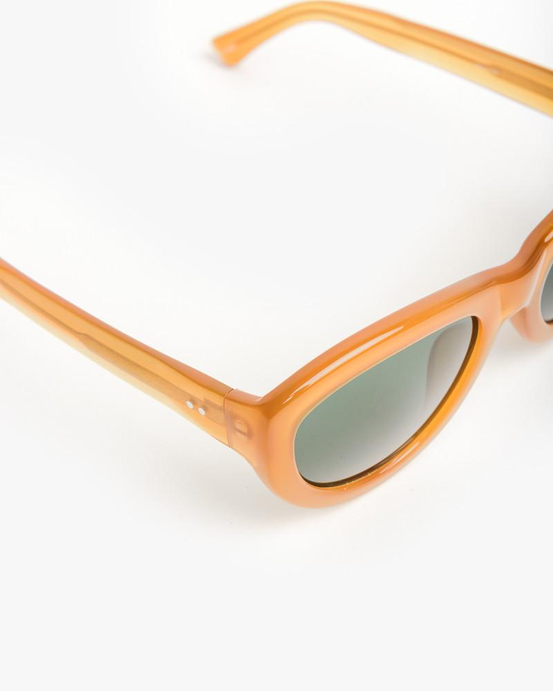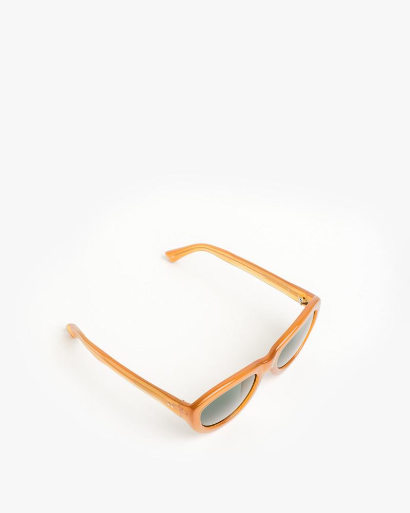 Sunglasses in Rust/Silver/Green by Dries Van Noten x Linda Farrow. Inspired by the grandeur of the Italian heiress and patroness of the arts, Luisa Casati, these Dries Van Noten feline angular cat eye sunglasses in a rust or amber color are handmade from high-shine acetate with green gradient lenses and signature beveling and stainless steel pin details at temples as well as Dries Van Noten branding in the inverted side of the temple.