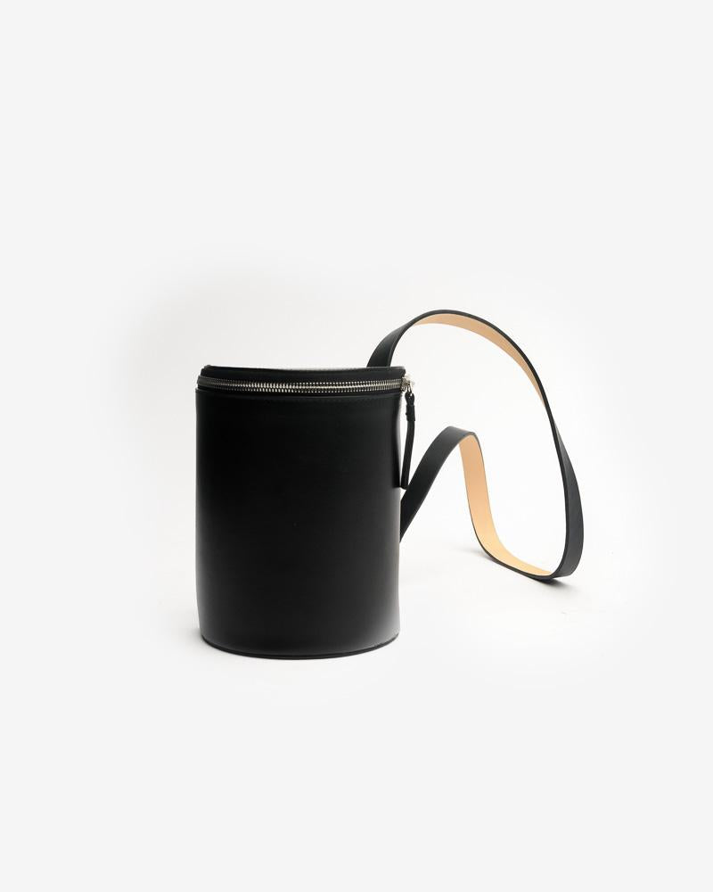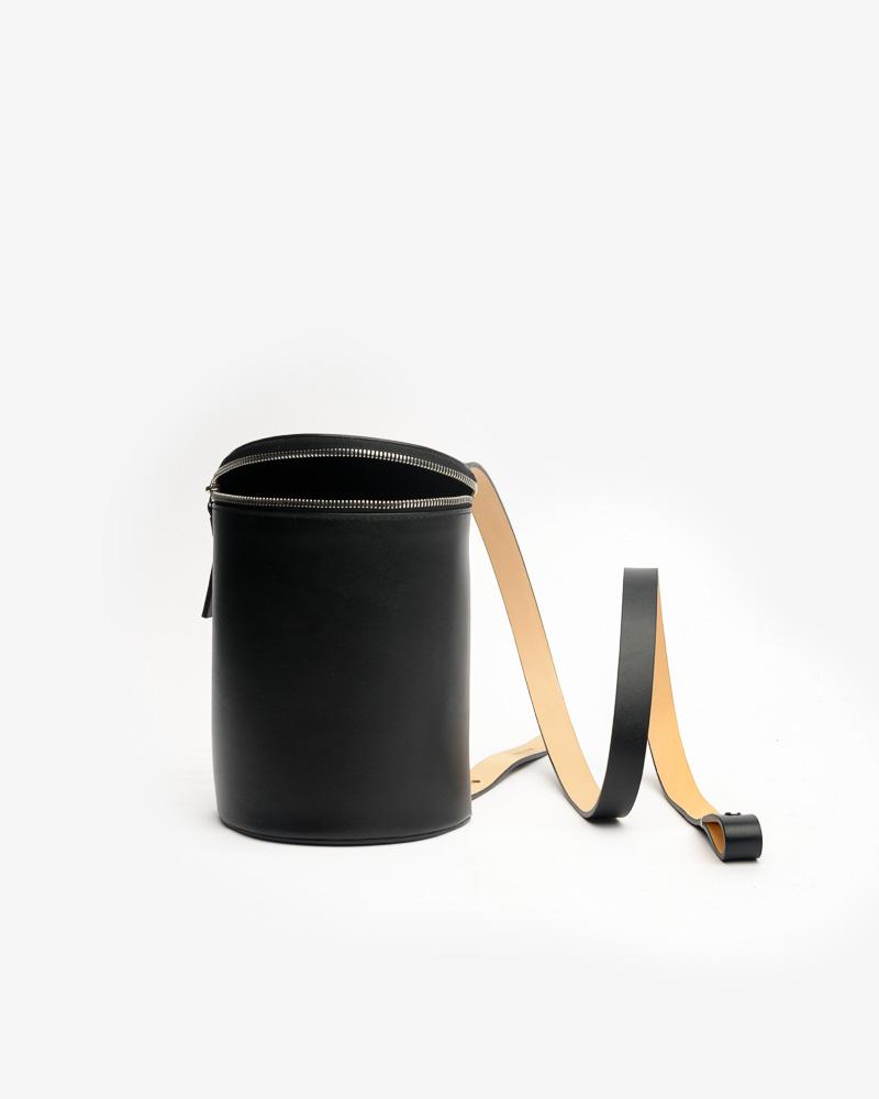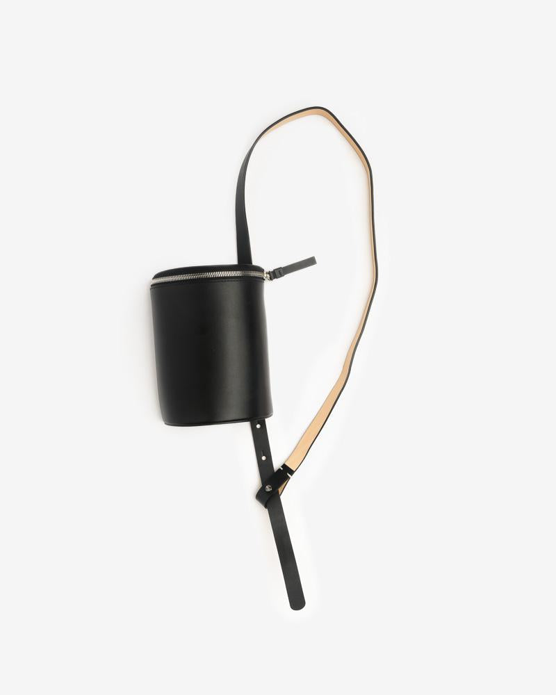 Beltpack in Black by Building Block. Made of smooth, buffed Italian leather, this half-cylinder shaped bag features an exposed silver side zipper closure with leather pull tab, a single cavity interior, reinforced semi-circle sides, and an adjustable and removable leather belt strap with collar pin closure.
