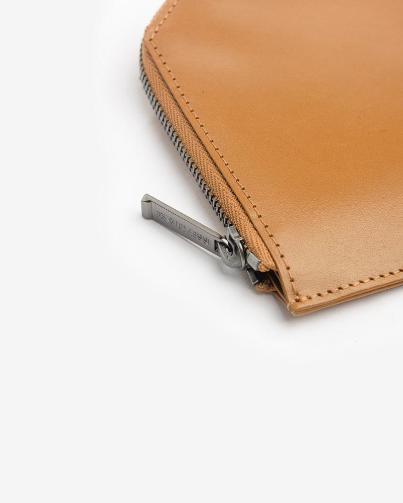 Flat Wallet in Tan by Issey Miyake Man. Made from soft, buffed leather, this wallet in tan features a zip closure with gunmetal-tone hardware, an embossed logo, patch pocket at interior, and tonal leather lining and stitching.