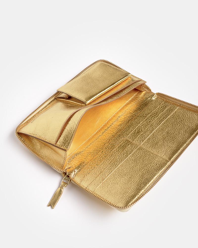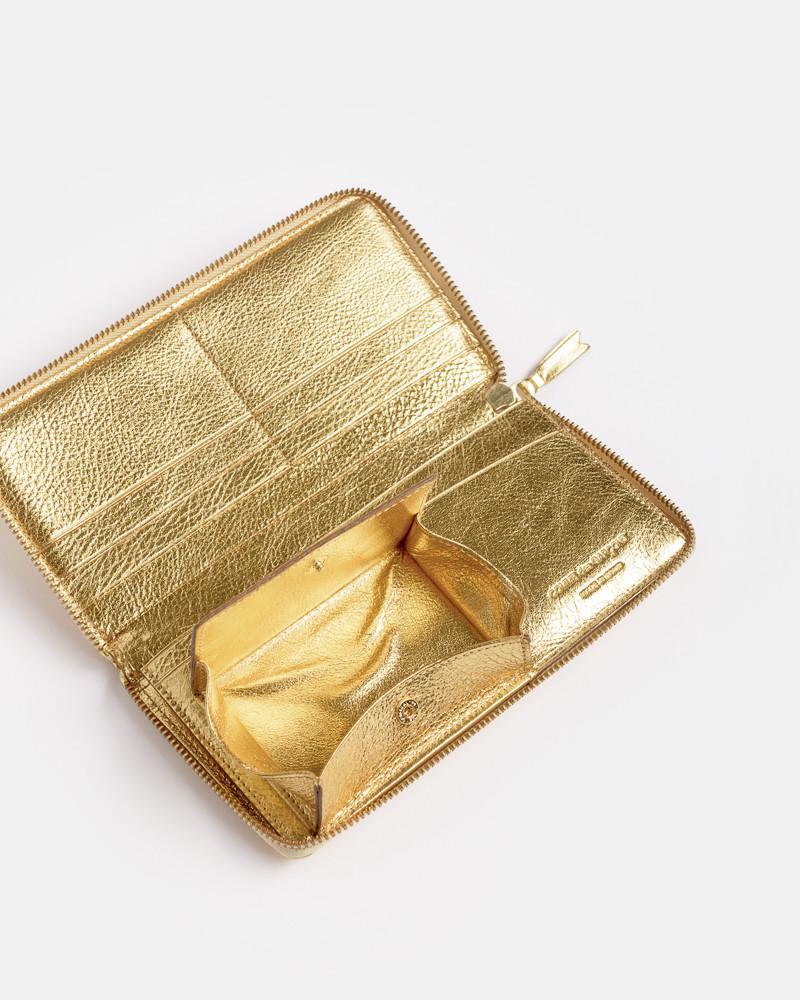 Gold Line Wallet in Gold by Comme des Garçons. A long billfold wallet in a gold leather features 6 credit card slots, 2 large bill compartments, snap pocket coin pouch, and checkbook slot with a matching gold zipper closure.
