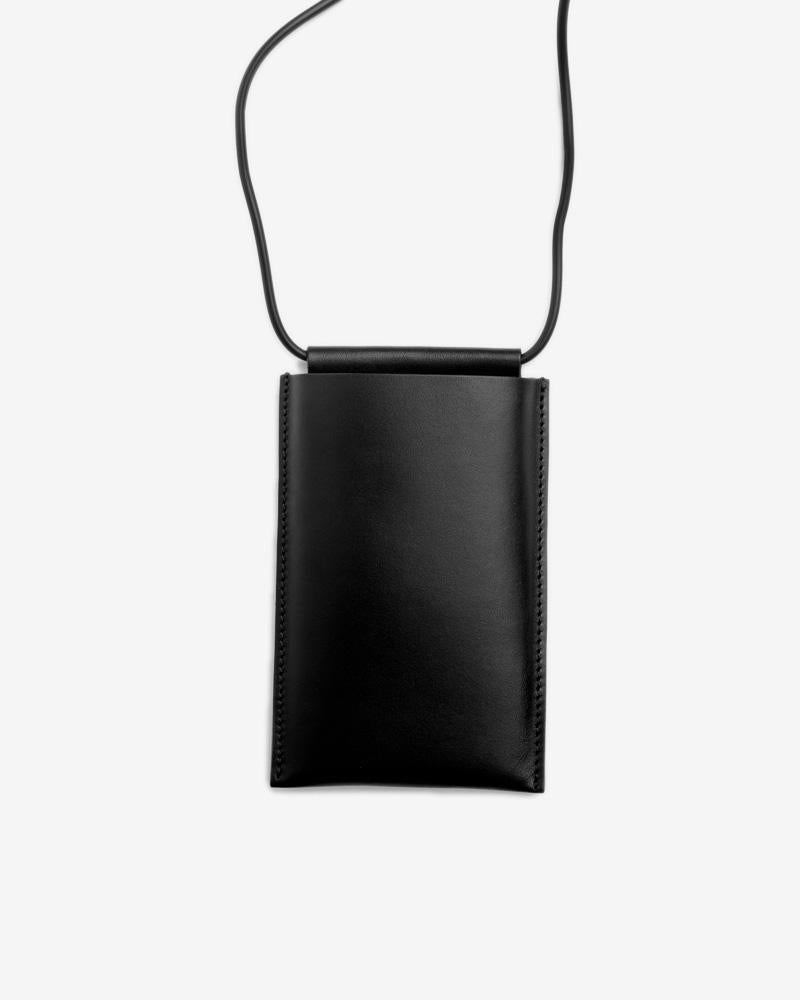 iPhone Sling in Black by Building Block. Made from smooth leather, this travel sling is designed to fit an iPhone 6, 7, and 8. It features a rubber shoulder strap, double card holder on reverse, embossed logo, and tonal stitching throughout.