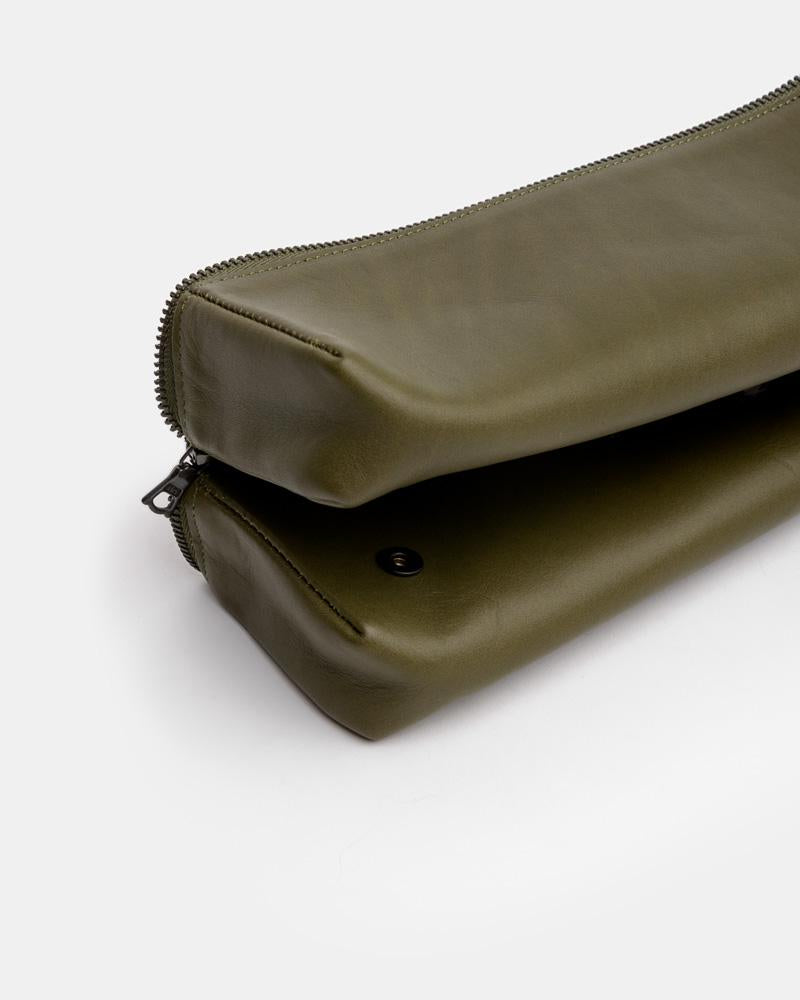 Magic Travel Box in Green Tea by Isaac Reina. Constructed from supple leather, this large travel box features a center zip opening, two press studs at the back that keep the box open when needed, one discreet interior pocket, and a debossed exterior logo.
