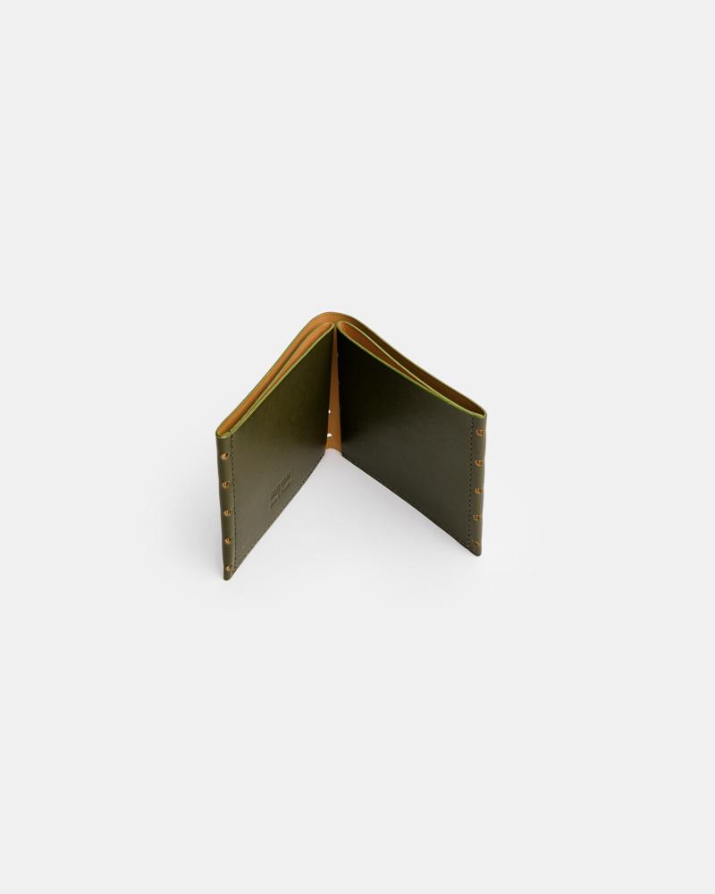 Perforated One Leaf Wallet in Green Tea by Isaac Reina. Constructed from a singular piece of leather, this minimalist bi-fold wallet features perforated holes along the sides and center divide, two pocket compartments, one bill/paper section, and a debossed interior logo.