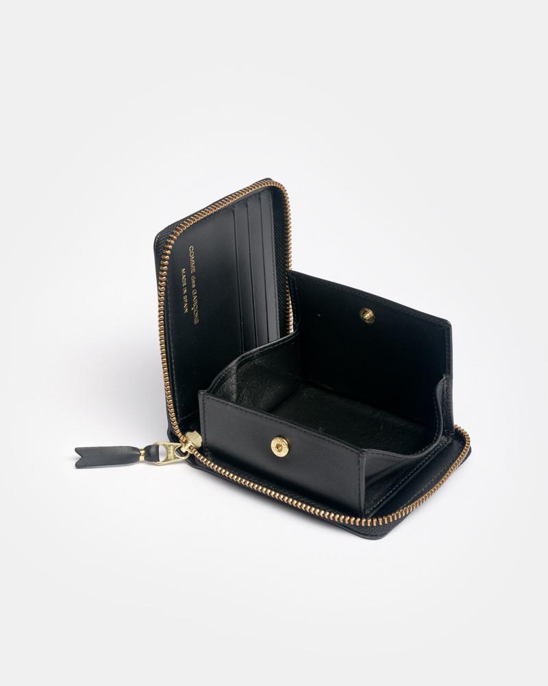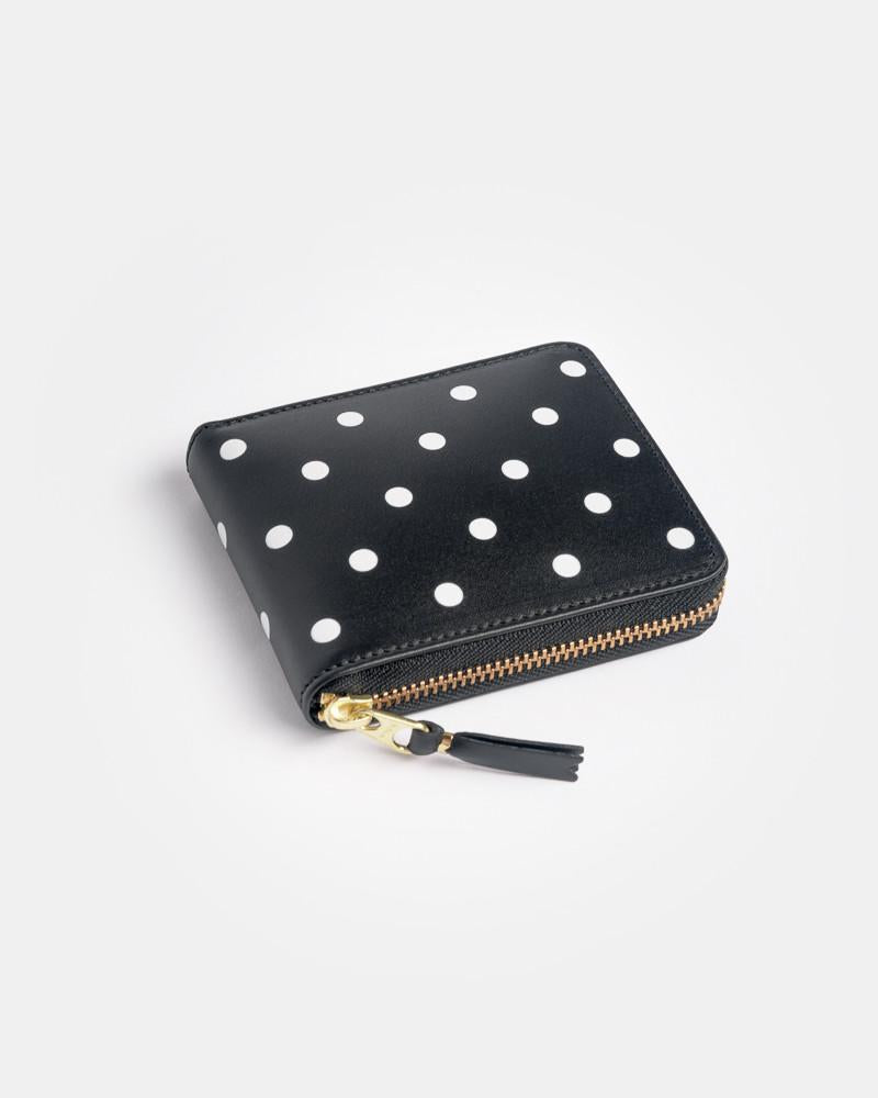 Polka Dots Wallet in Black by Comme des Garçons. Perfectly sized for daily use this zip wallet features a smooth leather outer in black with white polka dots, gold tone zipper with leather zipper pull, full black interior, three card slots, single cash bi-fold pocket, signature CDG snap coin pouch, and gold embossed logo at interior.