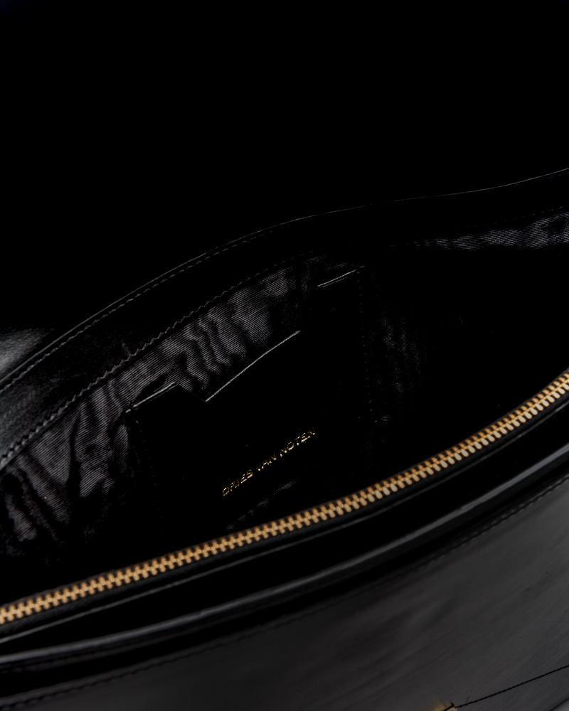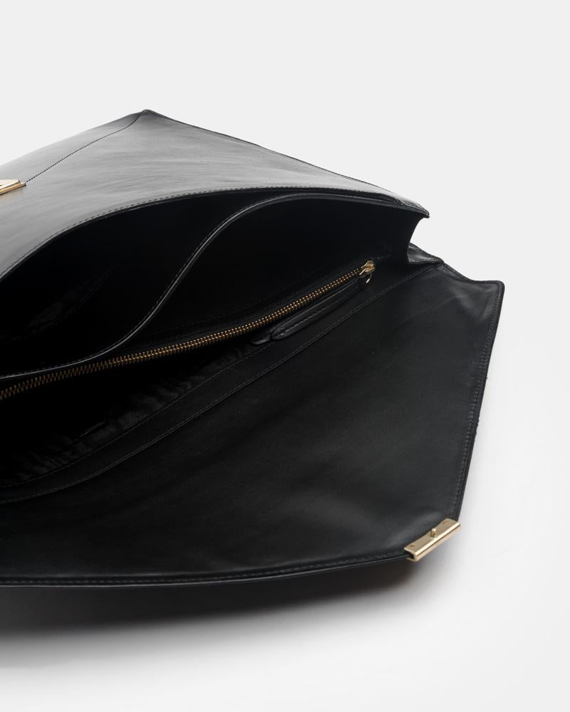 Portfolio Holder in Black by Dries Van Noten. Flat envelope style pouch features a smooth vegetal tanned leather that will wear beautifully over time, gold-tone center clasp, two long interior compartments separated by a long zip pouch, document slot inside flap, single credit card holder, textured fabric lining, and gold debossed logo at back.