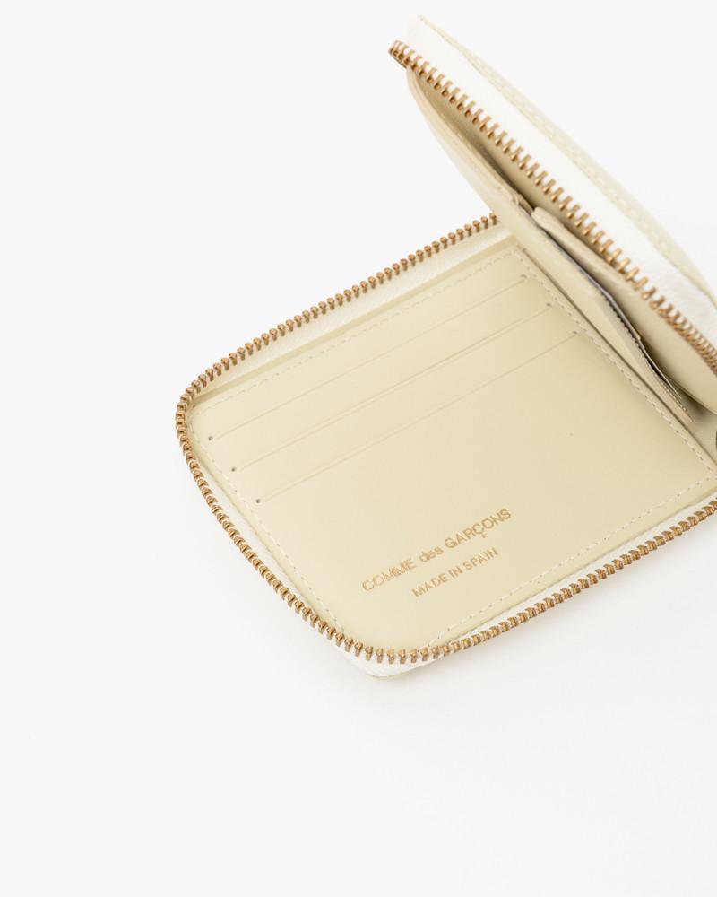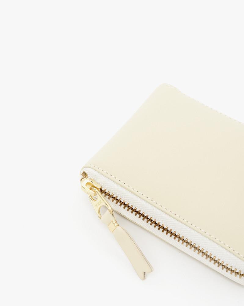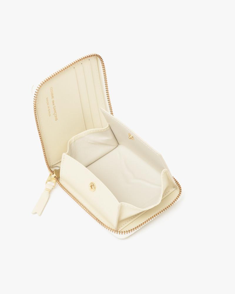 Classic Leather Line 7100 in C by COMME des GARÇONS. Small zip wallet in cream features smooth leather, 4 card compartments at left, coin purse at right, 1 billfold section, gold zipper, leather detailing at end-of-zipper, fabric perimeter between leather and zipper, and logo at left-interior in gold font.