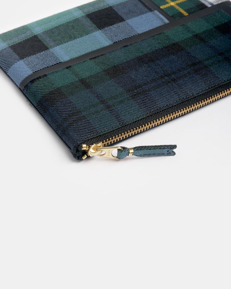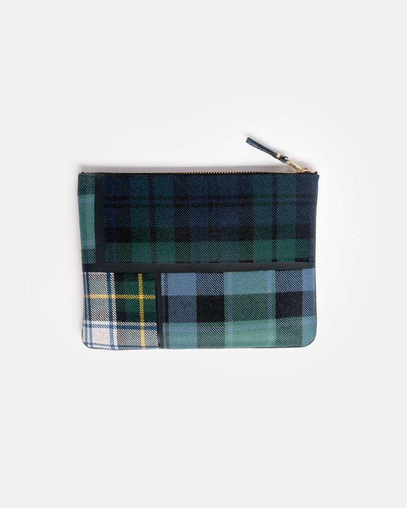 Tartan Patchwork Pouch in Green by Comme des Garçons. This large pouch wallet with a green plaid exterior with black lines that separate pouch into panels, with a smooth leather interior, clean lines, rectangular aesthetic, rounded corners, gold zipper closure and leather detailing at end-of-zipper.