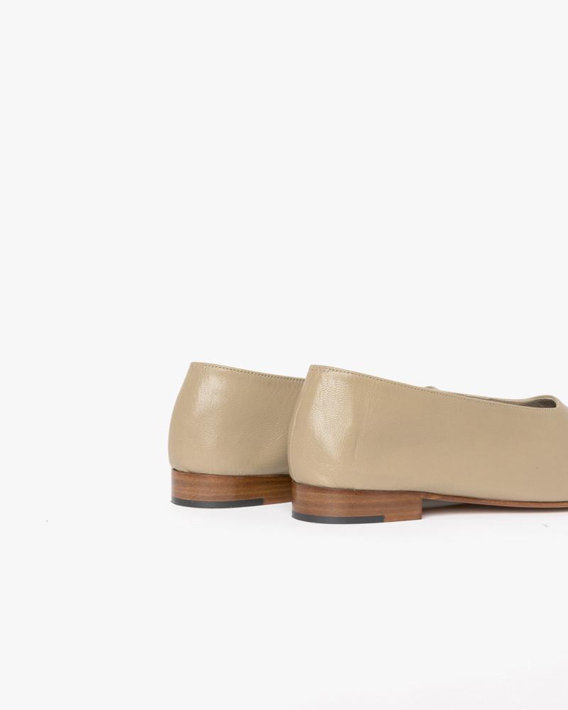 Glove Shoe in Champignon by Martiniano. Simple leather slip on features nude shiny leather, a rounded toe, narrow silhouette, low wooden stacked heel, leather insole and lining, lined cuff, and a flexible fit that will mold to your foot.