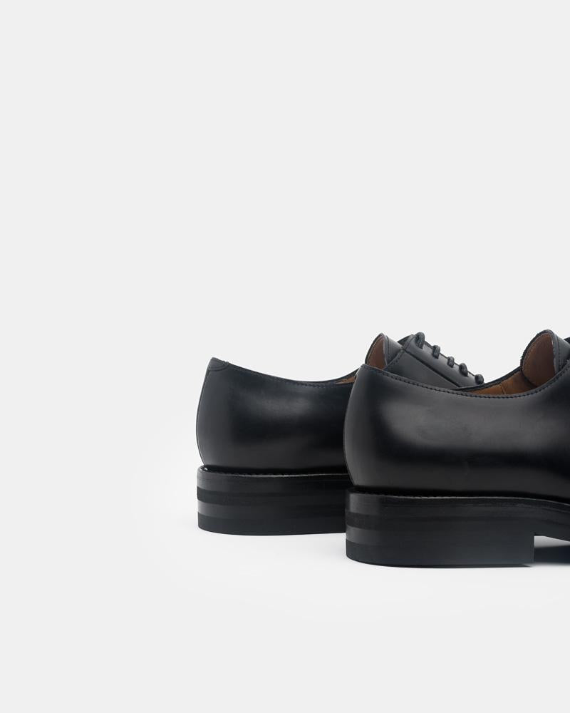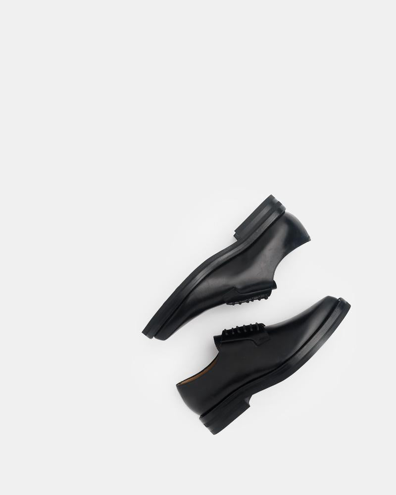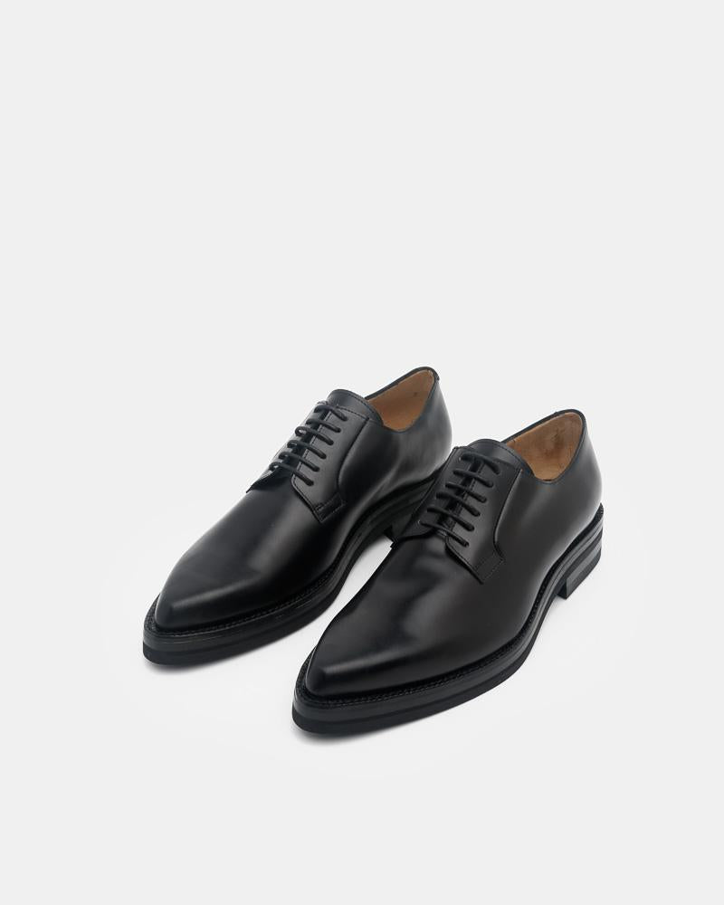 Pointed-Toe Oxfords in Black by Dries Van Noten. Crafted of smooth black leather, these elegant oxfords feature a pointed toe, stacked heel, stitched welt, a lace-up style with black round laces, leather lining, rubber sole, and tonal stitching throughout.