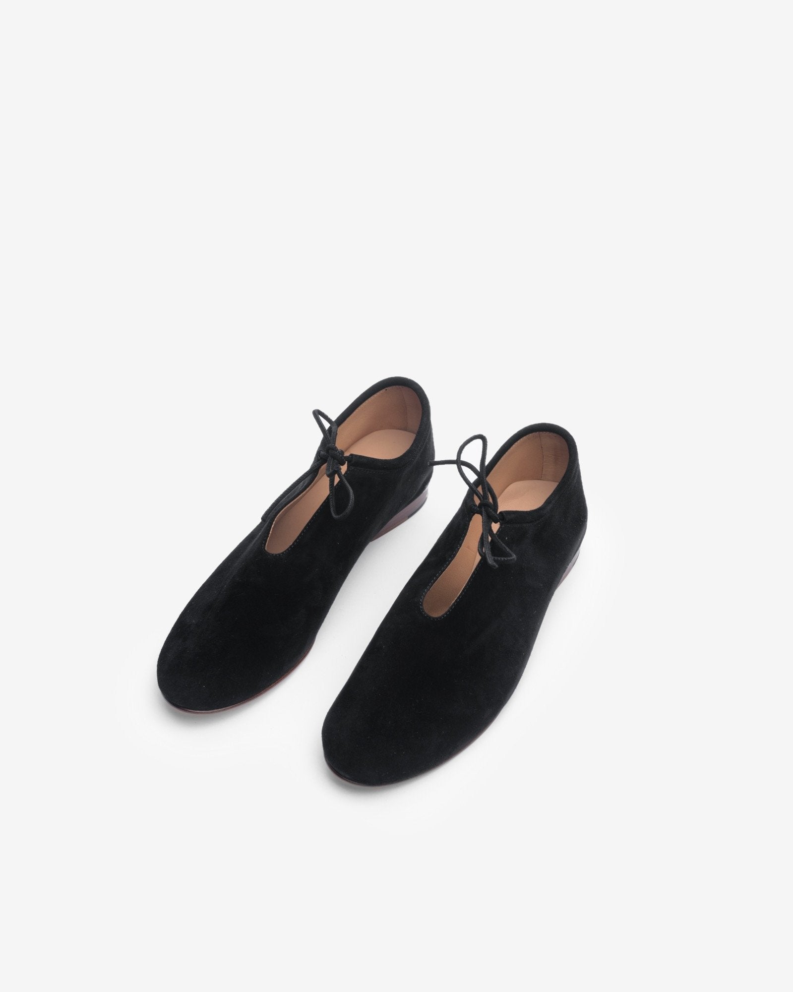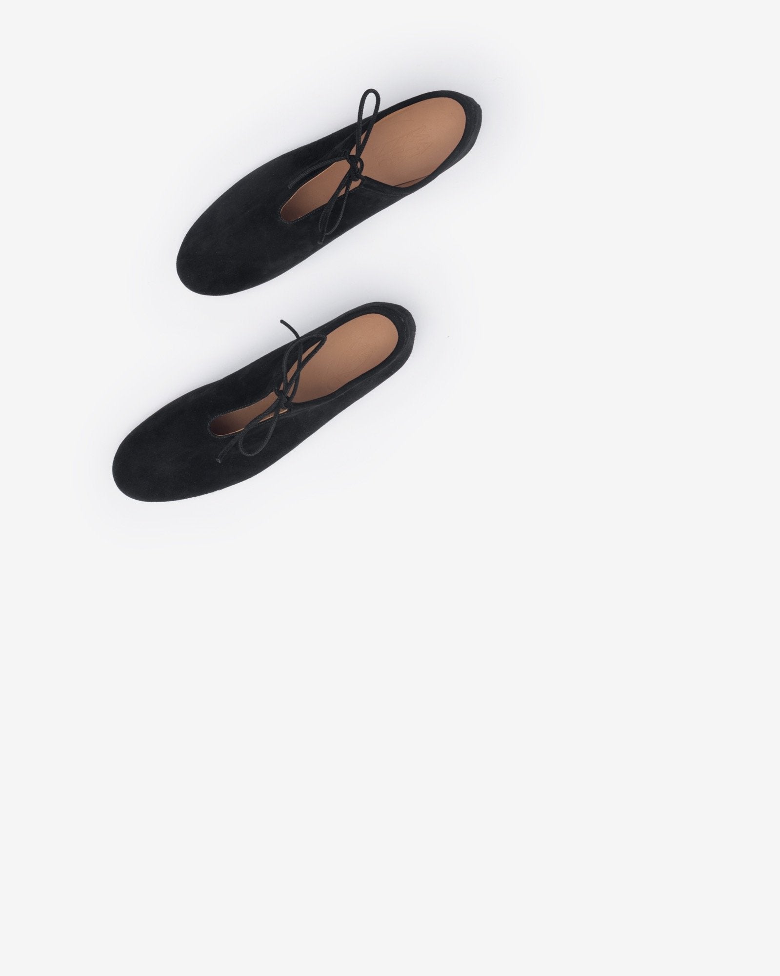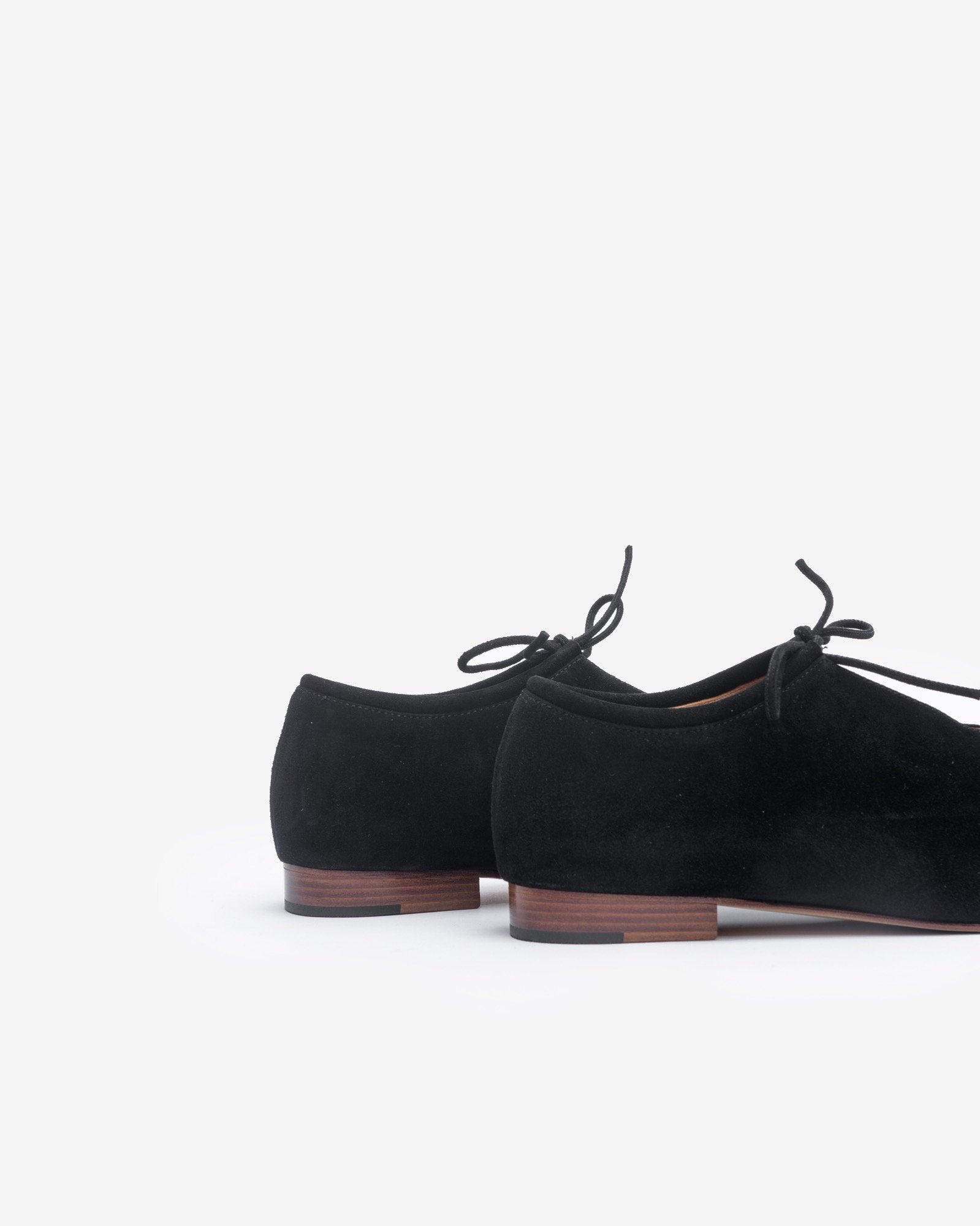 Suede Bootie in Black by Martiniano. These simple kidskin suede flats in black feature a round toe, narrow silhouette, lace-up closure at vented collar, tonal leather sole, tonal stitching, low wooden stacked heel, and a flexible fit that will mold to your feet. Designed in Argentina, the label's minimalist shoes adhere to the Japanese philosophy of wabi-sabi, a practice that celebrates natural materials and their imperfections.